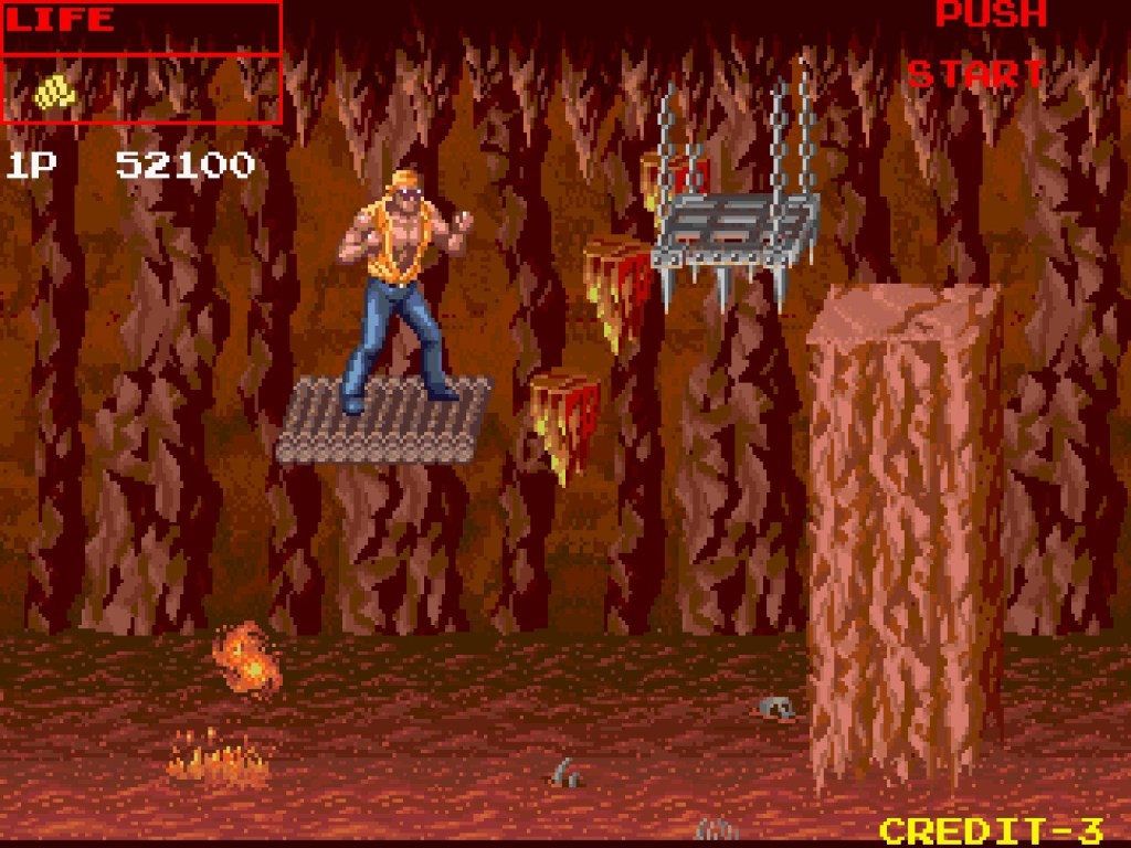 The whole thing is just so much mindless fun, not that it’s easy though – there are DIP-switch settings that tone down the difficulty, but even though you can see then end in about twenty minutes, you’ll be doing very well to get there in the handful of continues that equal the handful of coins I might have had in my pocket in the arcade, which I use as a measure of success for these things! I think the problem is the whole thing is really designed for four players, and anything less will get exponentially overwhelming at some point. The final boss is too cruel of a beast too… Assuming you get through the lava cave platforming bit! Bit of patience for both is my advice… However far you get though, and whether you’re mashing buttons or deliberately and rhythmically double-tapping, you can’t help but adore the insanity of the non-stop explosions, the violence, the out-of-place sexiness and the marauding wildlife in the bulk of the game! There are things to not adore though… As well as lacking in the sophistication of something like a Final Fight to play, there are times the gameplay is a bit rough around the edges too. For example, if an enemy has been floored too close to the edge of the screen, you won’t be able to finish them off with the brutal series of knees to the face attack because you can’t walk close enough to the edge; frustratingly, you’ll have to give them the chance to get up (meaning the chance to attack you) then have another go instead. And that’s even worse when a weapon – for example the rocket launcher that’s helpfully dropped halfway through the final boss – gets knocked out of your hands and you can see if but can’t walk to it! The enemies aren’t the sharpest of tools either, with the Dolls especially prone to pulling a hand-grenade out of their cleavage then throwing it at something it will bounce right back off like an exploding boomerang!However far you get though, and whether you’re mashing buttons or deliberately double-tapping, you can’t help but adore the insanity of the non-stop explosions, the violence, the out-of-place sexiness and the marauding wildlife in the bulk of the game! There are things to not adore though… As well as lacking in the sophistication of something like a Final Fight to play, there are times the gameplay is a bit rough around the edges too. For example, if an enemy has been floored too close to the edge of the screen, you won’t be able to finish them off with the brutal series of knees to the face attack because you can’t walk close enough to the edge; frustratingly, you’ll have to give them the chance to get up (meaning the chance to attack you) instead. The enemies are the sharpest of tools either, with the Dolls especially prone to pulling a hand-grenade out of their cleavage then throwing it at something it will bounce right back off, like an exploding boomerang!