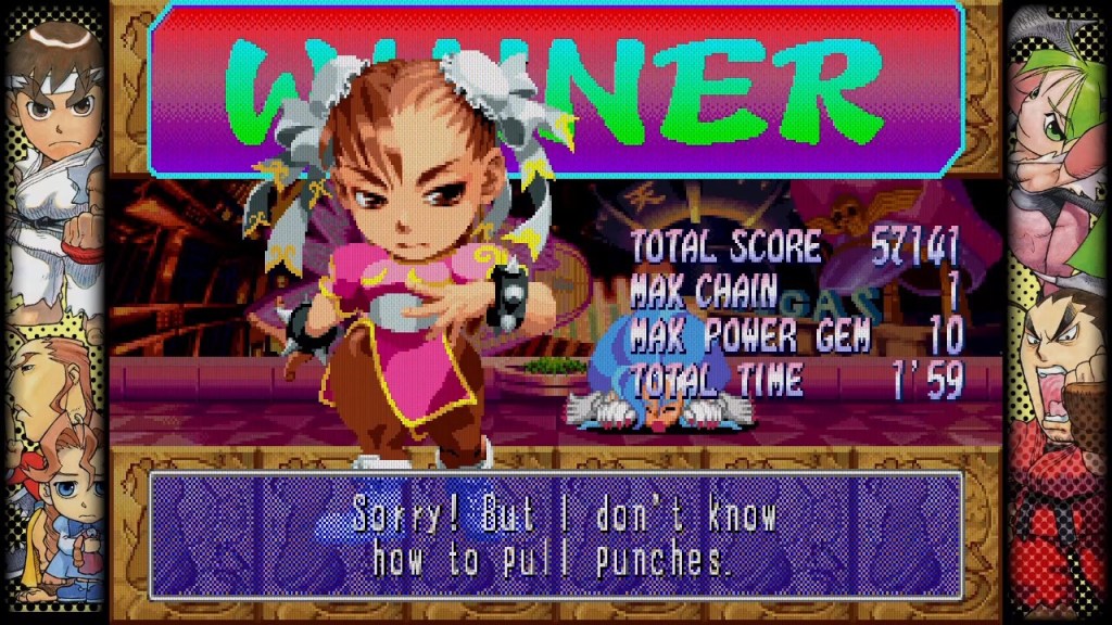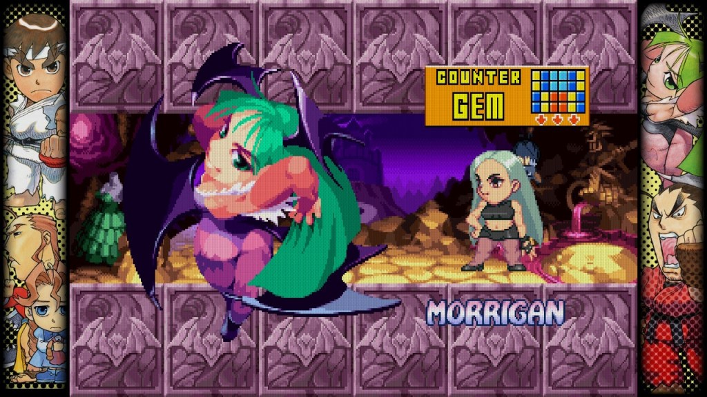 I wouldn’t go out of my way to look for super deformation or chibi-style in my art, but it’s always interesting to see it applied to something you’re invested in – Morrigan from Darkstalkers, for example! It all fits the vibe perfectly here though, to the point that I can’t imagine anything else working in that little fighting arena in the middle of the screen. Perversions aside, in my opinion that applies more to the Darkstalkers characters on the whole than the Street Fighter ones; they’re just more interesting, with their gaudy, decadent, gothic backgrounds that cleverly spread into the two gem pits without being intrusive, and their alternate costumes and, er, pets and the like! But they’re all stacked with character in their own right, perfectly authentic and recognisable, and constantly doing something, whether looking bored or disappointed, taunting their opponent or pulling off some effect-laden special move, which obviously doesn’t quite reach Darkstalkers standards but, again, makes you wish you could watch what’s going on there rather than the actual play area when things are getting fruity! And whatever your colour preference, there’s not an area of the screen that isn’t constantly in your face, and with those eight-plus unique characters and environments, not to mention that chaos of the gem formations, the colours are constantly changing too, like some kung-fu cartoon disco. These games might be all about the gameplay, but being such a looker, and such a familiar one too, does it crank it up a notch further!