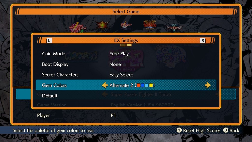 No sympathy required though, but what is very, very welcome is not only to get any kind of update from the likes of Capcom, months after they’ve launched a collection of old games, but when one of those games is fundamentally updated more than twenty-five years after the event to be more inclusive of the dodgy of eye! If I remember right, the Capcom Fighting Collection arrived at the end of June 2022, and then this update appeared out of nowhere at the end of September. It included the usual load of bug fixes and tweaks to online play, but also several added features, mostly built into its training modes, such as hit box displays, or gem level options in Super Gem Fighter, or the ability to practice some of Darkstalkers’ more esoteric moves! And, of course, we got the new “Gem Colors” option added to Puzzle Fighter, where you can choose between the original palette of gem colors and up to 6 different alternate palettes – a veritable something for everyone, and not to mention a literal total game changer after such a long time!