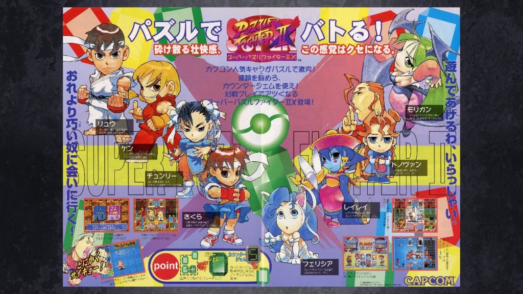 Right, now we’ve established how I’m recently qualified to talk about Super Puzzle Fighter II Turbo with a bit more authority, we should talk about the game! It’s Japan, it’s 1996, and Compile / Sega’s colour-matching puzzler Puyo Puyo 2 (another one I can’t see) has been doing mad business in the arcades – the biggest thing since Street Fighter II, no less! Wanting a piece of that sweet versus action, Capcom came up with the cunning plan to combine the best of all worlds, first riffing off the name Super Street Fighter II Turbo (or Super Street Fighter II X in Japan), then a bit of the series’ presentation, and finally its characters (with a helping of Darkstalkers too), ending up with what was the first puzzle-fighter despite having the number II in its name! Anyway, Super Puzzle Fighter II Turbo (or Super Puzzle Fighter II X in Japan) released to immediate success in the summer of 1996, then made its way to America for the end of the year and Europe in July 1997. Home ports on the PlayStation and Saturn followed, then later there were local releases on the Dreamcast and Game Boy Advance too, and while we won’t go into most of those in any more detail here, I might put my eyes through that GBA version a bit later, just out of curiosity!