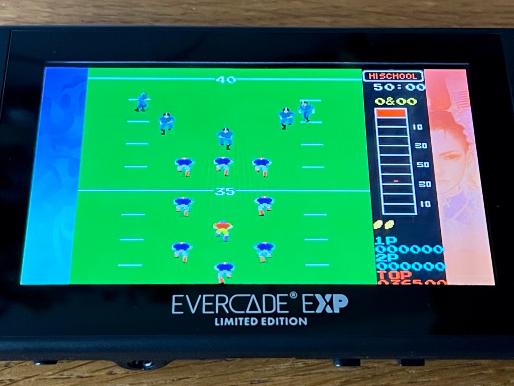 What I did also get to play a load of, though, was the new Irem cartridge that also comes in the box. I know I’ve said it before but I’ll never cease to be amazed when I play arcade R-Type at home, let alone in my hand! Few games ever blew me away like the original did back in 1987, and I’m so glad I can play it here now too! I do have In The Hunt on PS1, and it’s another stunner, but had never even seen the 1993 arcade version before, so of everything here this is probably the big one for me! It’s a beautiful submarine shoot ‘em up, and maybe more methodical and slower paced than some as a result, but crammed full of colour and detail that will be familiar to any Metal Slug fan, and an impressive amount of variety too. Ten years earlier next, and 10-Yard Fight, which is a primitive American football game and a huge favourite of mine for a long time, which might reflect my own primitive (but enthusiastic!) knowledge of the source material. It’s simple but tactical enough, with you advancing as far as you can towards a touchdown before the clock runs down. It’s not football at its most sophisticated by any means, but it’s not meant to be and the arcade scoring mechanic makes it hard to put down once you’re into it!