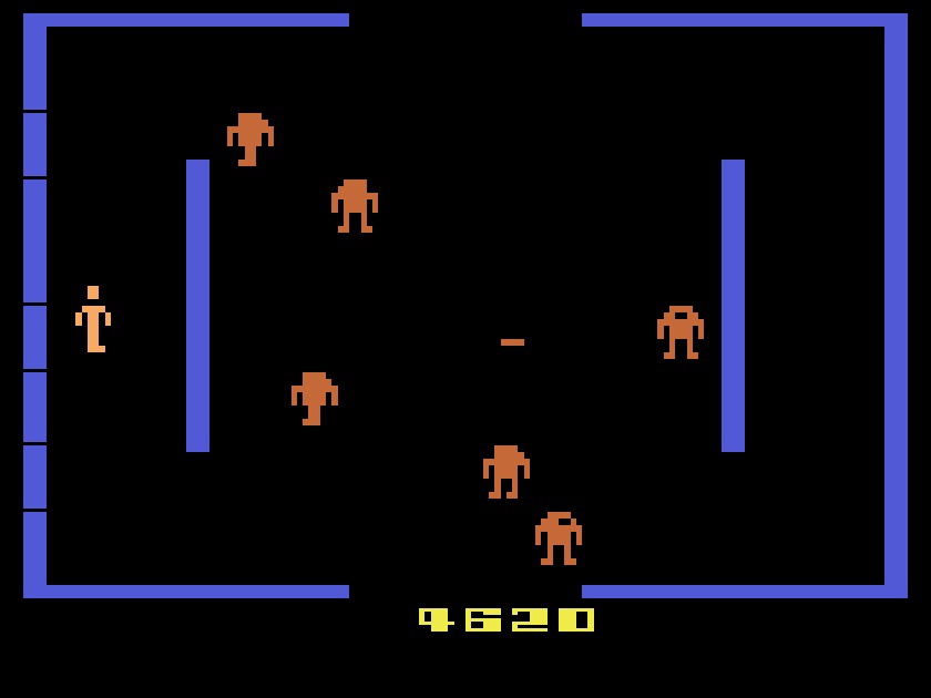 I’ll finish this week by going even further back in time to Berzerk in 1980 by Stern Electronics, which is a top-down, flip-screen multidirectional shooter where your little green stick man finds himself in a simple maze-like room with electrified walls and a load of increasingly aggressive robots. Hang around too long before escaping to the next room and your nemesis, Evil Otto, will appear; he’s a bouncing smiley face that will head straight in your direction, although he’s more of a mechanic for hurrying you up than as much of a threat as the stupid robots and stupid walls! They get brutal fast, you see, but there’s no chance you’ll see that many of the 256×256 grid of rooms as the robots change colour a few times the further you go, each time indicating they can fire more bullets at once. Funny thing is, I started out with the Atari 2600 version, and as much as it annoyed me, there was something to it and I played it for way longer than I originally planned. Could be a gentler difficulty curve or possibly less twitchy controls than the arcade game it was based on, which was just plain annoying! Plenty of mad speech synthesis on that version though, and apart from Stratovox from Taito, I believe it was the first arcade game to do such a thing!