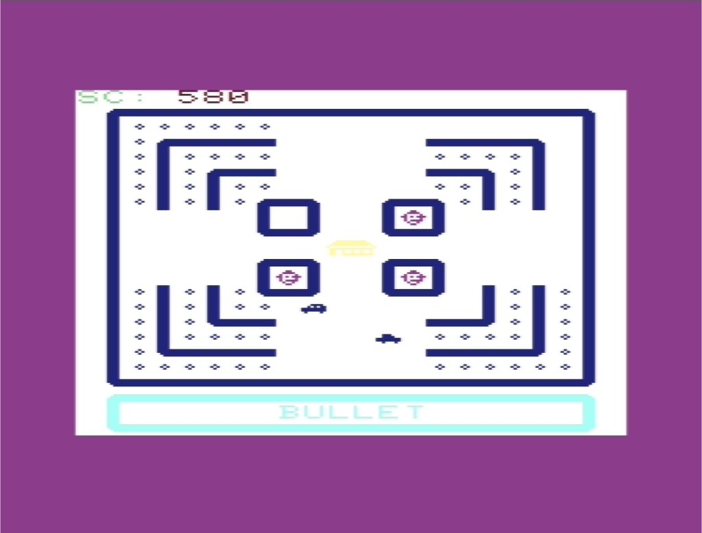 I was really fond of Bullet when it also came out in 1984! It starts out as a clone of the old arcade game Head On, where you’re automatically driving top-down, round and round several lanes of city streets on a single screen, collecting all the coins and avoiding the cop car travelling in the opposite direction. You can switch lanes to avoid it, and if you get all the coins you’ll move onto the next screen, where you need to rob one of four banks. You do this by travelling around the screen Snake-style, avoiding where you’ve been or you’re caught and back to chasing coins again. This was a simple but really great budget title with some classic arcade mechanics that are still fun nearly forty years later. Really glad I rediscovered this one!