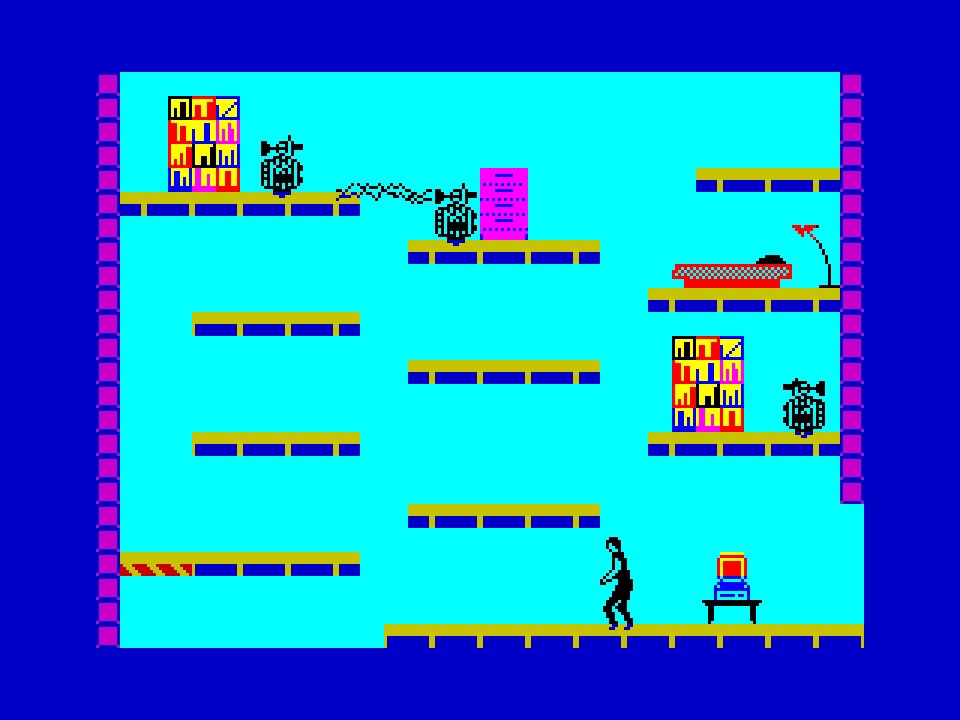 There’s a load more nonsense backstory about Elvin before we learn that using the fortune he amassed from hacking into various financial institutions, Elvin constructed a vast underground lair packed with all his computer equipment (as well as a few favourite items of furniture), and from there he spent the last four years breaching the world’s military computer installations, which he now seems to be all done with because you now have just six hours to prevent the big missile attack. By “vast” the instructions mean a total of thirty-two rooms, which, to their credit, seems far more vast than that when you’re playing! Some of these are just living quarters and some are computer rooms, but each will usually have a series of floors or catwalks that are connected by lifts (but not the cool lifts I mentioned earlier!), and these contain the items you’ll need to negotiate your way to and search one way or another, as well as Elvin’s killer robots, and as such the rooms themselves present the game’s first puzzle because, of course, you’re not necessarily going to find a lift on the floor you really want it to be on!