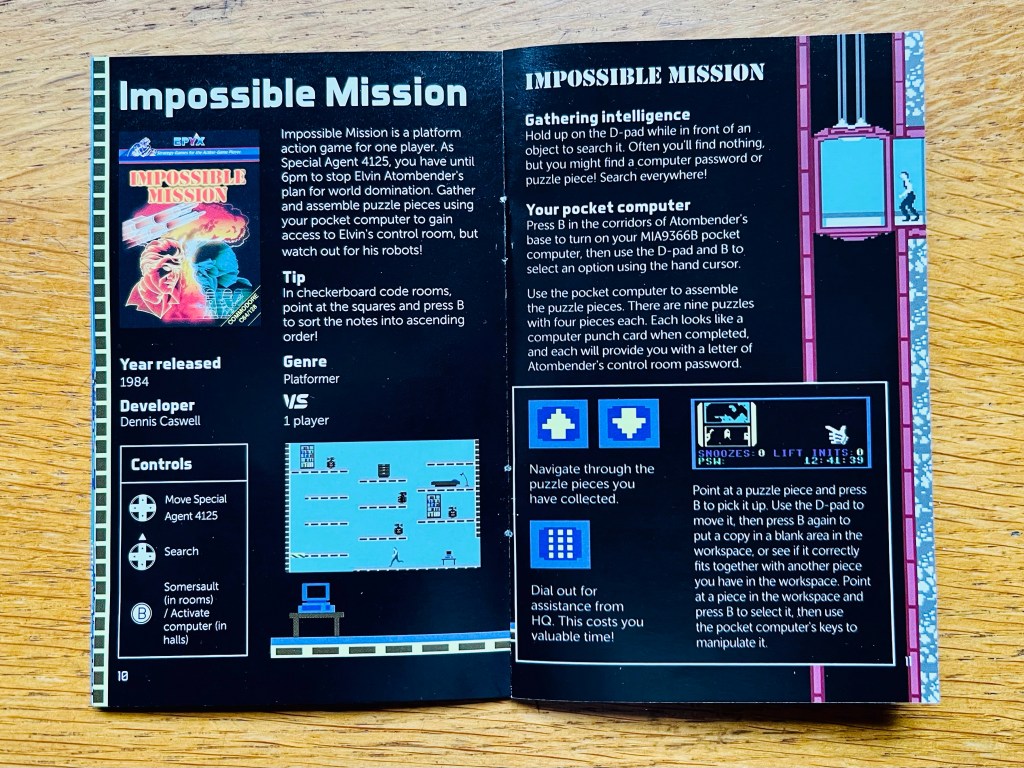 Coming back to Impossible Mission, in my defence, I didn’t own the Commodore 64 where I was happy just to be mesmerised by cool somersault animations and the thrill of using the lifts. Okay, now I’ve written that down I realise maybe you had to be there for the latter but I won’t hear a word about that jump not still being spectacular to this day… Even if it is often a bit excessive when you just want to cross a little gap! But we’ll get to all of that shortly! In the meantime, until The C64 Collection 1 cartridge for Evercade came along towards the end of 2022, apart from a quick couple of minutes when the C64 Mini arrived in 2017, I hadn’t touched Impossible Mission on the C64 for the best part of forty years, since around 1985 I guess, although I I had it on the Spectrum too, I think in U.S. Gold’s Summer Gold compilation. Not sure, doesn’t matter, and really wasn’t the same anyway, which we might also come back to later! Anyway, one of the great things about Evercade cartridges is they come with a lovely old-school instruction booklet, and they really went to town on Impossible Mission in this one, so I finally knew what I was doing and was maybe even able to properly appreciate what all those magazine reviews were raving about at the time – which I assume wasn’t just a nice lift! By the way, while I have been playing through Impossible Mission on my Evercade VS and biggest TV for maximum pleasure, it’s a nightmare getting decent photos on there when I’m balancing a phone camera in one hand and trying to manipulate the controller in the other, so for the purpose of some pretty screenshots I’ve just grabbed them separately from emulation using VICE on a PC instead!