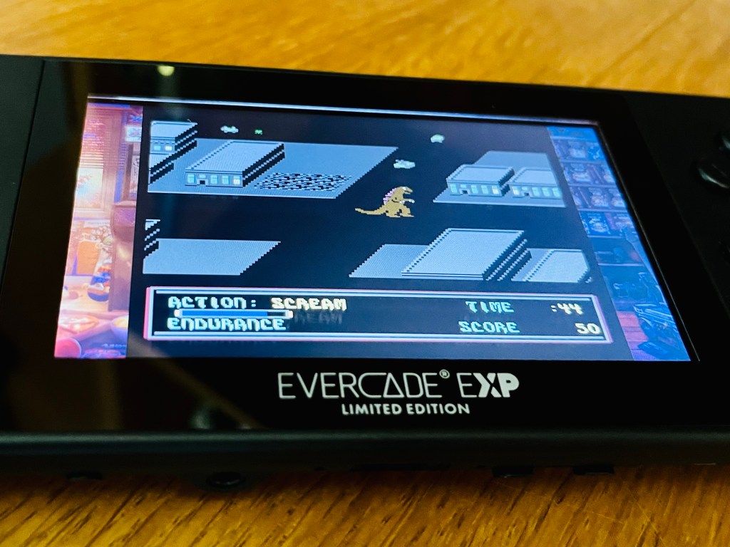 (Sorry for the reflections in the pic – nightmare getting a decent shot of these things)! I mentioned last week I’d started out on The Movie Monster Game for Commodore 64, which is on The C64 Collection 1 for Evercade, where I’ve been playing handheld. Actually, I’ll quickly mention here I’ve had problems with this cartridge, where both Summer Games and Winter Games have stopped loading. They replaced it immediately but same again with the second cart – play for a while then just stops working. Turns out it’s a current firmware bug so I hope that gets sorted soon because I’ve played those two especially loads since it came out! Anyway, Movie Monster! You choose your monster of choice from a big cast of not-quite-Godzilla, not-quite-The Blob, not-quite-Megatron, and so on, then the iconic isometric city they’re going to flatten, then the scenario to complete, such as escape the city, destroy its famous landmarks, eat all you can or just cause loads of damage. Each monster has its own mechanics and attacks, and everything is presented like a movie, in a cinema, so you’re effectively the director with an all combinations of the three variables to try out. It’s really ambitious for 1986, and while there’s not quite as much variety when it comes to actually playing, I’ve had a great time trying out the different monsters because that’s where the real variety is, and it doesn’t hurt that I’m a huge monster movie nerd either! I am quite tempted to do one of our deep-dives into this so watch this space!