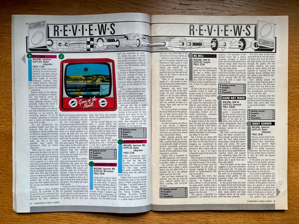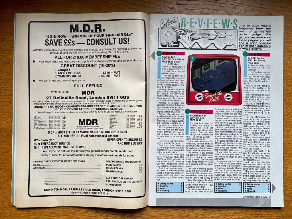 Back to that second Game of the Month then, and it’s another I’ve never heard of, and it’s Psytron for the ZX Spectrum! “All the normal features are here – sound effects and joystick options.” If that’s not game of the month material, I’m not sure what is, but it seems like it’s a sci-fi arcade-strategy game that takes a long time to play – the last of the six levels alone appears to involve surviving an attack for an hour! Despite all the words, and the recommendation that if you’re a fan of this type of game you’ll love this, it doesn’t actually say anywhere what type of game it is beyond arcade-strategy. Whatever that is! What I’m getting is a primitive take on something like Night Trap (yes, you heard me right!) where you’ve got ten different views of your base that you need to monitor for intruders then take (arcade) action. I’m still not getting where the strategy comes in but it seems there’s loads of it, and despite scoring way less than the seminal proto-budget BC Bill for the C64 on the opposite page, it’s apparently very much worth the £9.95 asking price and its Game of the Month accolade. Again, don’t watch this space however pretty it looks though!