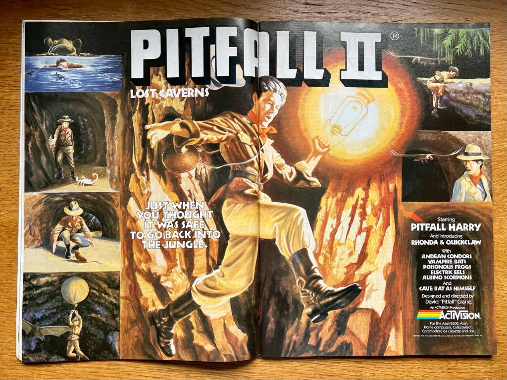 Before we get there, though, there’s a huge double-page advert for Pitfall II which is definitely the most striking advert in the whole magazine! The adverts are always another highlight for me with these, as well as the thrill of remembering seeing all-time favourites for the first time – I’m not such a big fan of Pitfall, so we won’t be seeing that in more detail here any time soon either, but in this issue alone there’s Chuckie Egg, Beach Head, Revenge of the Mutant Camels, Football Manager, Moon Alert, er, Kosmic Kanga and more we’ll come back to! Back to Pitfall II first though, there’s clearly a lot of work gone into this, and even if it’s not all of the highest order in terms of artistry, it’s obvious enough you’re getting Indiana Jones, and what’s not to love about Pitfall Harry swimming past electric eels in front of a giant frog, or floating past a giant bat on a homemade hot-air balloon?