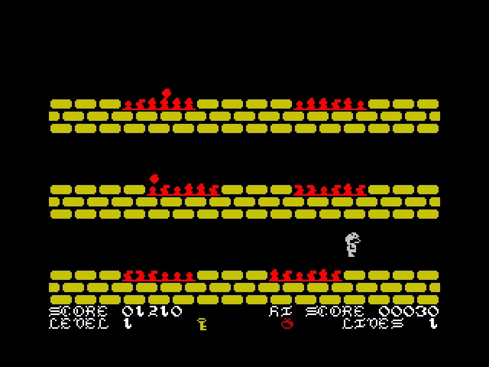 Something I did appreciate, though, was being able to travel directly between levels and not have to negotiate that dreadful fire screen on the Spectrum version! It involves running and jumping over three levels of burning pits stacked on top of each other on the screen, so you’ll start bottom left then emerge from the right side of the screen middle left and so on until you come out top-right. And it would be frustrating enough without having to contend with the fire balls being randomly thrown across each level too! Jet Set Willy this ain’t – not even a type-in version – although what it’s actually trying to be is Hunchback, which we also came across earlier, but ends up being it’s far less enjoyable clone Punchy instead… Also advertised in this very issue of C&VG – it’s got everything! Actually, Punchy is another good example of a game that’s better on the VIC-20 than on the Spectrum, where it’s punishing but vaguely enjoyable on the former while just smash your Kempston joystick nasty on the latter! Anyway, once again, for the VIC-20 version we’re better off without this “bonus” screen on Tower of Evil. I guess though – given this is having a go at being Atic Atac – it needed to do a bit more on the Spectrum where real Atic Atac lives, and they do have another 40K of memory to play with over there too! Because I couldn’t get the C16 / Plus 4 version to work, I might as well quickly finish with the Spectrum one while we’re here – the graphics are a bit bigger and cleaner but not dramatically so, there’s a bit more sound (including a very-Spectrum circa 1984 ditty on the title screen) and obviously there’s a bit more to the game as we’ve seen already, but in terms of minute-to-minute gameplay there’s really not a lot in it. Until you try to climb to the next floor!