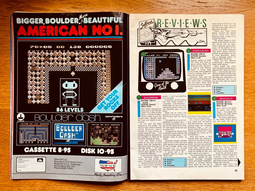 We had a look at the January 1984 issue of C&VG earlier, and now it’s the turn of the December one from that year, though as we’re running way longer than I originally planned, I’ll try and be a bit briefer this time! In the news we hear about the imminent release of Activision’s Ghostbusters – one of the great Commodore 64 movie licenses – and while the Spectrum version lacked a bit of its polish, fear not because we also learn that Sabre Wulf on there is getting no less than two sequels, by the name of Underwurlde and Knight Lore, no less! Game of the Month is Boulder Dash on the C64 and rightly so, and there’s some fantastic versions of Tapper too, as well as loads of ports of stuff like Jet-Pac, Ant Attack and Jet Set Willy to places they didn’t originally belong. Raid Over Moscow gets a decent review too, although a bizarrely large “editor’s comment’ box questions its taste, arguing that nuclear war is not a subject for fantasy! In the arcade section, Return of the Jedi is the headline act, and there’s type-ins for the Spectrum, C64 and BBC, and Daley Thompson’s Decathlon tops the charts, closely followed by Elite, and there’s tons of full-colour adverts for some all-time classics that are ideal for cutting out and putting on your bedroom wall. What a time to be alive!
