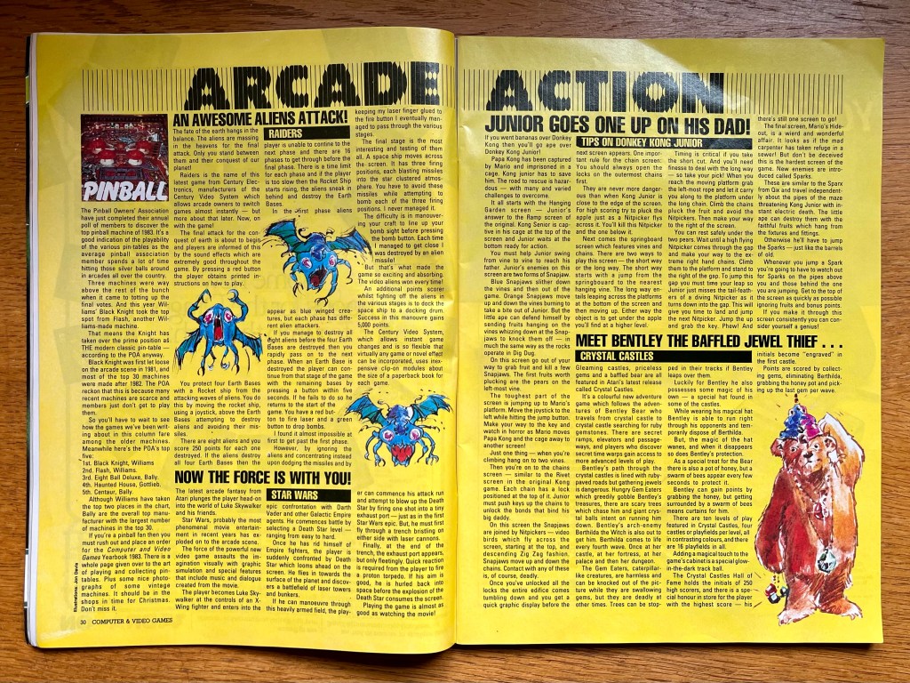 Over in the arcades, there’s news of what would soon become the most exhilarating thing I’ve ever experienced in a video game to this day, the timeless vector-graphics masterpiece in a sit-down cabinet, Star Wars from Atari. So immersive, and such a perfect representation of the climax of the movie, with all the sights and sampled sounds, and the authentic X-Wing flight-stick… Wow! Doesn’t stop there either, with both Donkey Kong Junior and Crystal Castles making first appearances, and that kind of thing is exactly the reason I wanted to start sharing this stuff, because there are no video gaming time capsules quite like this! And on that subject, I’ll get onto reviews for the month in a second, but they (as well as related news and features) are generally split into two totally separate categories, with “video gaming” covering home consoles such as Atari 2600 and Colecovision, while “software” covered the increasingly more common home computers.
