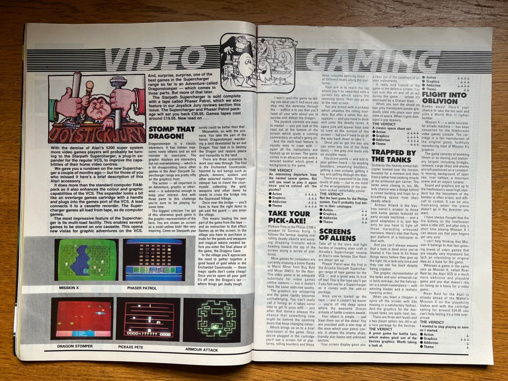 And with that, let’s take a quick look at those “video gaming” reviews, which this month focus on something I’ve never even heard of before, the Starpath Supercharger peripheral for the Atari 2600, or VCS as it was more commonly known at the time. We’re told that following the “demise of Atari’s 5200 super system” this is what players will be turning to improve the capabilities of the regular VCS. It’s an expander that plugs into the console’s cartridge slot, and, as well as boosting RAM, colour and graphics performance, allows you to plug in a cassette player to multi-load either individual games from a single cassette, or experience expansive new graphic adventure games such as this month’s headline act, Dragonstomper! Unfortunately, all that excitement soon fades as we learn the adventurer here is still just a yellow blob, and rest is simply “interesting” rather than supercharged! Even less interesting is Pickaxe Pete, another Donkey Kong clone for the Philips G700 (which I’ve also never heard of!), and then there’s a terrible take on River Raid for Intellivision called Mission X, and an intriguing tank battler called Armour Attack for an even more intriguing new machine called the Vectrex, which we’ll also come back to later!