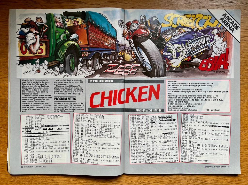 Now it’s time for that stalwart of the computer games magazine in the early- to mid-eighties, the type-in, and as mentioned earlier, there’s some very special ones to look at among the no less than fourteen of the things here this month! Let me give you the rundown on the regular ones first though, starting with some simplified takes on some very familiar arcade games by way of BBC Invader for the BBC, Chicken for the ZX81, and Light Cycles for the Dragon 32; the best thing about these is that like all the great clones (even if these aren’t quite that) you know exactly what you’re getting from them! There’s also a cool ski game, Slalom for the Texas TI 99/4A, the self-explanatory Duckshoot for the Atom, space catch ‘em up Stardust for the Apple II, maze game Escape From The Bastille (complete with full-screen guillotine!) for the Sharp MZ80K, pyramidic adventure Venture 16 for the Spectrum and Logjam for the Atari 400/800, which is pages and pages of BASIC plot and position commands resulting in a very nice log-pulling tow-boat game!