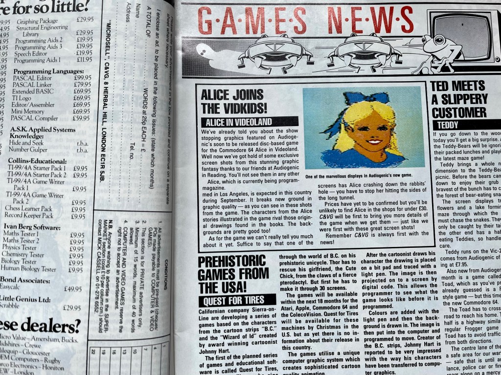 Right, we’re up to date, so the plan now is just to flick through the magazine together, check out its news, reviews, features and notable adverts, and I’ll pull out anything that catches my eye in the order it catches it. And speaking of eyes, you might want to grab a pair of 3D glasses for this one! Actually, I was amazed that for my relatively bargain price for this, it came with the original blue and red cardboard glasses, and they’re absolutely pristine! I’ll come back to all that when we get to type-ins because it’s not just pretty 3D artwork we’ve got to look at here either! For now we’ll start with the news, although the majority of it seems to be free publicity for Rabbit Software’s arcade “copies” like the “sophisticated, complex and challenging” Joust or Paratrooper for the 16K Spectrum, which is described as loosely based on Space Invaders but I reckon sounds just like Commando Raid from 1982 for the Atari 2600, or even Sabotage on the Apple II that in turn inspired that. There’s also the “showstopping” graphics on the upcoming Commodore 64 game Alice in Videoland to admire, a first look at Sierra’s B.C.’s Quest for Tires, and, best of all, a picture of a bloke called Jim who was the first person to complete Manic Miner and won a brand new TV for his efforts!