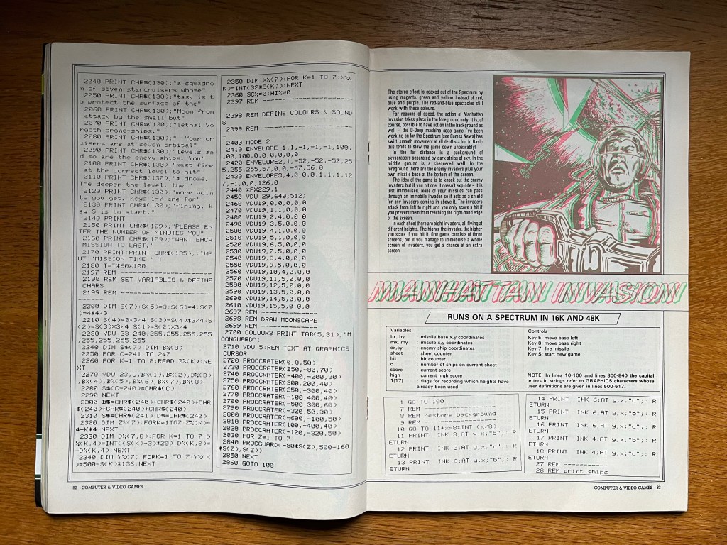 Time to grab those 3D glasses now because the rest of this month’s type-ins are not only about to literally leap out of the screen at you but are all coded by none other than Mike Singleton of The Lords of Midnight fame! After an explanation of how stereoscopic 3D works, there’s a really fascinating insight into doing things like displaying two distinct pictures to create the effect on all the different popular computers of the day, which is compounded by the need for “pure” blues and reds, that’s all well and good on the BBC or C64 but much trickier with the blues converging on blacks on the Spectrum, although as we’ll find out, there’s always a means! The listings here cover the BBC B, the Spectrum, the Atari, the Commodore 64 and the VIC-20, each one designed primarily to be fun while also delivering a decent 3D effect through your free glasses, but also accompanied by extensive program notes to make sure you are able to try programming your own 3D glasses games if you so desire. Which I definitely would have, so let’s have a quick look at each one!