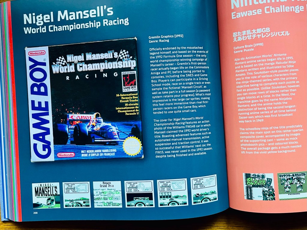 Back at the start of 2022, I took a very favourable look at Game Boy: The Box Art Collection from Bitmap Books. The thing’s still a beast too, with 372 hardback pages covering the box art from almost as many original Game Boy games! With so many to choose from, to give a flavour of what was inside I decided to pick a few examples, including a couple of old favourites of mine, as well as the one that jumped out of the pages at me the most, something I don’t know at all and finally something I’ve never played before but would like to as a result of reading the book. And you can read the review to find out what they all were, but the last of them was Nigel Mansell’s World Championship Racing, and the plan was to get into a bit of a deep-dive here once I’d got around to playing it…