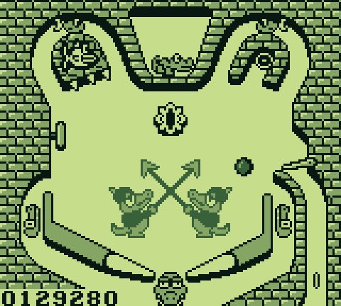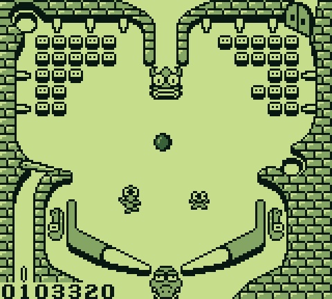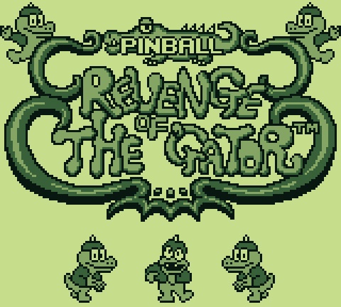 There’s not really any control over the plunger even if it’s not quite binary – release too soon and it won’t make it over the wall and into the play area, or pull it back further (or fully) and it will be carried into play with the same initial velocity regardless. Unlike the very floaty ball physics of something like Pinball Dreams on the Game Boy (or anywhere else, for that matter), the ball here has an excellent and surprisingly realistic weight to it, feeling as heavy as it’s dark metallic-effect “colouring” makes it look. The visual presentation overall is top-notch, similarly detailed beyond normal expectations for a pinball game on a Game Boy everywhere you look, which more than makes up for the plain backgrounds, which probably couldn’t be any other way given how much stuff is on top of some of them! The table is given structure by very textured, almost organic brickwork, which I guess represents a sewer because that’s where alligators definitely live, contrasting with patterned-tiles in the bonus areas, both housing the menagerie of comically animated alligators and other Hungry Hippos-type critters, creating a living theme that’s full of character that also extends to many of the various bumpers and targets, while others are more traditional but also full of movement or light. There’s a really cool fruit machine display on one of the screens too, but coolest of all is the big-eyed, alarmingly jolly alligator waiting at the very bottom screen for a ball to eat that almost makes your eventual demise less painful! So many different alligators too, each with their own personality, and given the distinct lack of colour afforded by the Game Boy’s monochrome display, the devs have done a remarkable job with shading to almost make you forget that’s the case!