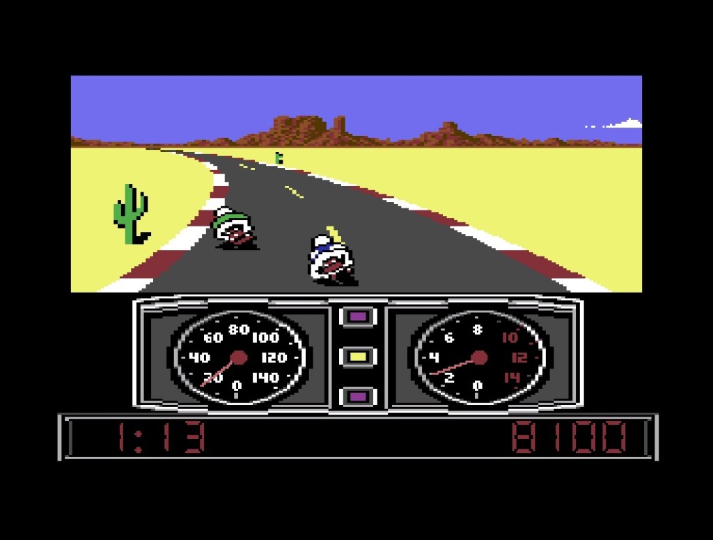 I’ve always been very fond of Super Cycle too, and would even rank it in my top ten games on the Commodore 64… Who says it can’t do racing games?!?! This is an arcade motorcycle racer, also by Epyx in 1986, where you’re going against the clock through mountains, deserts, forests and cities, both during the day and at night, and through water, ice and various hazards on the road, as well as the pack of fellow bikers. It’s a lot like Hang-On, and although it’s a bit more sparse to look at, what’s there is nicely detailed and coloured, it moves smoothly and at real speed, and controls really well once you’ve got a feel for throwing the bike around. Probably a bit easier than Hang-On too, although you’ve got three increasingly unfair difficulty levels to choose from, which reminds me, you can also choose your bike colour, and the style and colour of your leathers. Take that, Sega! Some really thoughtful button-mapping to save your poor old thumb on the d-pad here too! The whining engine noise does grate a bit once you’re in top gear and with nowhere else to go but apart from that I’ve got nothing bad to say about this. Love it!