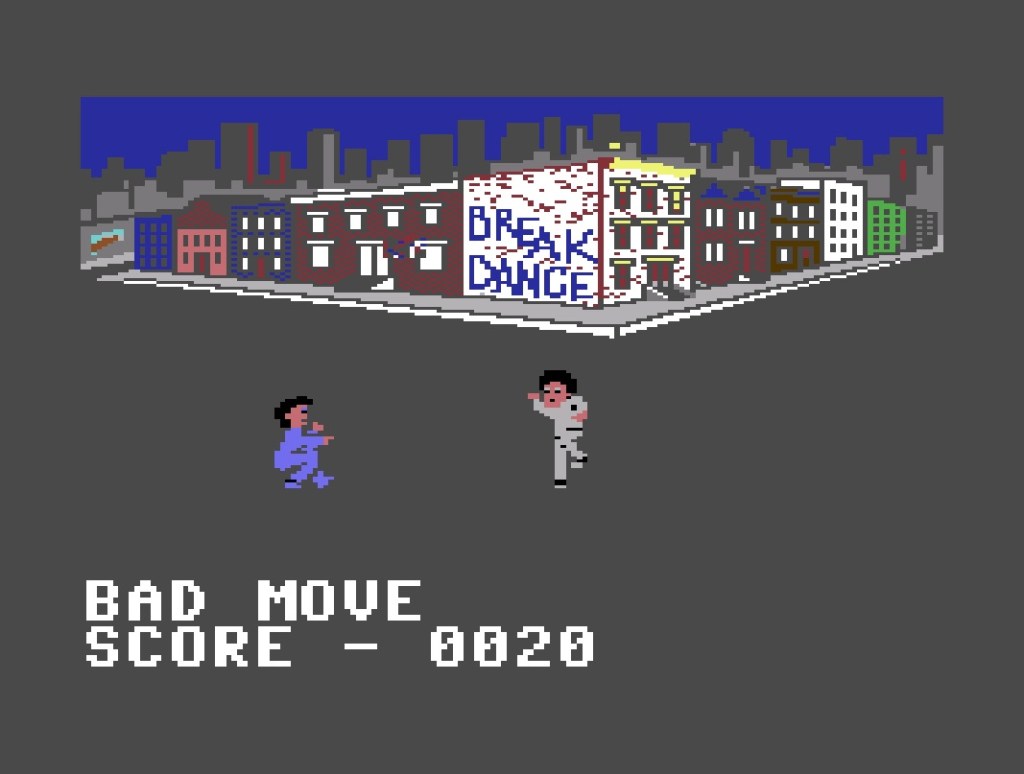 There may be a case for the exact opposite being true of Break Dance (or Breakdance), but I have to confess to having a soft spot for this, despite never having even played it until now! Back at the start of 1985, in the very first issue of what would become an almost decade-long collection of Computer & Video Games magazine, there was a picture of Break Dance, which didn’t only bring to life the biggest thing since the BMX at the time, but just looked so exotic to this still new VIC-20 owner! Which I appreciate might be hard to believe nowadays, but it was, so there! As exotic as it might or might be though, it’s a rhythm game from Epyx in 1984, who, like Hewson, I’ve just realised we’ll be hearing a lot of in this collection! Anyway, it plays like that old electronic tabletop game Simon from around the same time, where you had to press the lights in the order the “computer” had just lit them, obviously getting more complicated and harder to remember as you go, but in this case you’re pressing up, down, left, right and fire to repeat a breakdance move, hopefully resulting in a lovely routine of squats and spins and robot stuff! There a four game modes on offer to do this in, with a dance-off doing the above against an opponent called Hot Feet, a battle where you try to avoid getting pushed into a river by copying the descending gang’s moves, a dance move sequence puzzle thing and freestyle mode on a nice stage to make your own dance, and then you can also combine them all for the Grand Loop best breakdancer contest. These modes do partially dress-up there not being a huge amount to any of this, although it’s more fun with two players if you can, and there’s still a contemporary charm to the dance animations and environments and SID-hop music, but unless you have nostalgia for it then it’s probably the weak point on this cartridge.