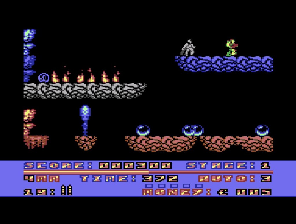 We can return to form with Cyberdyne Warrior though, a sci-fi fantasy action-platformer by Hewson in 1989 that I remember the name of from back then but couldn’t have told you anything about until right now! But I can now tell you it’s huge, it’s brutal and it has an absolutely wonderful title tune that’s somehow ominous and upbeat all at once, and could only come out of a C64! That goes for the chunky and earthy graphics in each of its three sprawling planets too, where you’ll find stylistic nods to Salamander, Space Harrier and R-Type in turn, and a splash of Warhammer 40K throughout. On each of these planets, you’re trying to recover some escaped, self-destructive droids that will take down everything else with them if you don’t do it in time, although you’ll pretty much have to do the same with the hostile locals to get at them! You’ll also be collecting coins to buy upgrades or replenish your energy and ammo, usually tucked away behind some hazard, and pretty much every screen you flip into is going to have a new set of them to work out. Real nice surprise with loads to explore and loads of depth too. Oh yeah, press space before you press fire to start the game and you’ll get strobe mode, with a lovely visual effect with every single gunshot. You’re welcome!