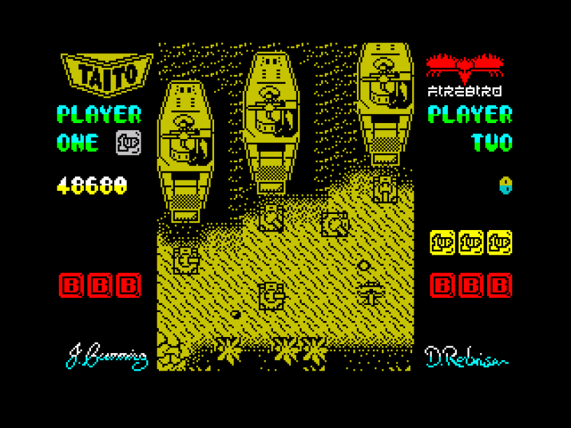 Flying Shark on the ZX Spectrum might be scaled-back and toned down, totally monochrome and extremely yellow, but you really couldn’t ask for more of this 1987 conversion of the Taito arcade machine from earlier that same year! Wherever you play (and I also recommend the Atari ST port), it’s a military-themed, vertically-scrolling shoot ‘em up, developed by Toaplan and, I reckon, close to their pinnacle in the genre, with your lowly biplane up against swarms of enemy aircraft, tanks, ships, cannons and some big, bad bosses, as you cross tropical jungles, villages, sands and high seas, you against the world! There are power-ups along the way to turn your initially weedy shot into something faster and more formidable, and bombs too, for when things get a bit too frantic, cleverly managed by holding the joystick down with a prolonged press of fire (which works better than it sounds). It’s nowhere near as frantic as its arcade counterpart though, which is probably for the best because with just black on yellow, and so much detail in the backgrounds, it’s easy to lose track of what’s where on the screen. Occasionally iffy collision detection doesn’t help either! It moves beautifully though, with its smooth scrolling possibly only matched by some of the most sublime music you’ll ever hear coming out of a 128K Spectrum! A real achievement that I know was overshadowed by those new-fangled (and impressively early) 16-bit versions on release but is definitely worth your time today!