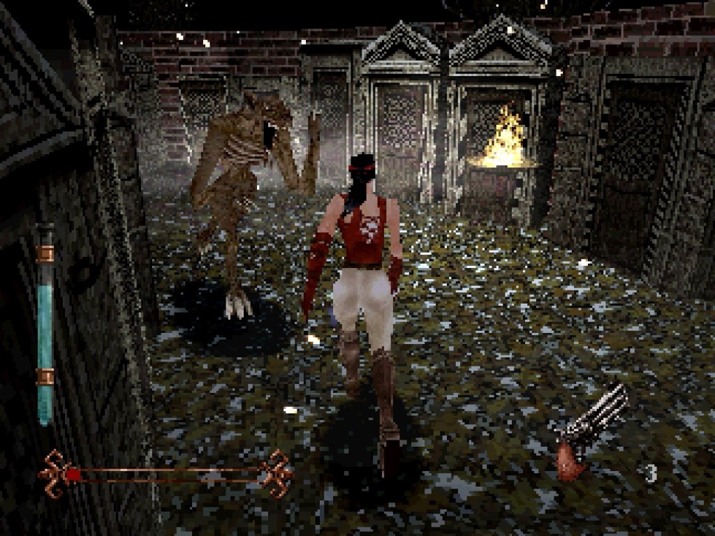 Remember everything I said about PS1 graphics earlier? Forget it! Your eyes will soon adjust to them anyway, and once you realise it’s tank controls all the way, they’ll be the least of your worries! Turn left, turn right and run forward isn’t the ideal setup for what in reality is more hack and slash than survival horror, in whatever year you’re reading this! And while you do get used to that too pretty quickly in general play, where it’s what the game was designed around so you’re never at a particular disadvantage as a result, just wait for the first boss battle! You’ve got sidestep left and right on the L1 and R1 shoulder buttons, pressing both will turn you right around, L2 lets you cycle through any special weapons you’ve found in occasional crates and R1 fires them. Then you’ve got strike or action, kick, jump and defend on the four buttons up front, while pressing up with any of them will make them a hard kick, long jump and so on. Both characters have their own repertoire of special moves too, and you can experiment with different button combinations to reveal these.