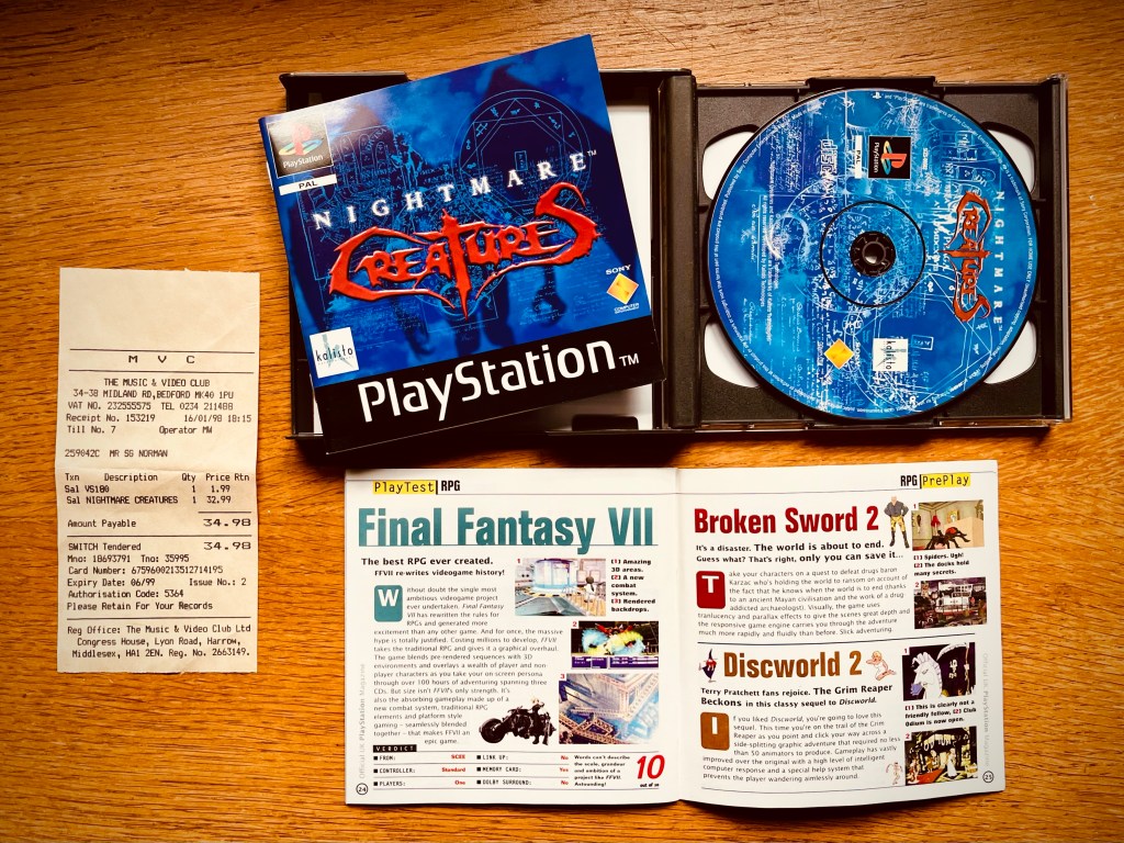 My receipt from MVC in Bedford that’s still in the box tells me I bought it on launch day or thereabouts for what I assume was their slightly reduced member’s price of £32.99. Says I bought something called “VS180” for £1.99 at the same time but no idea what that is – possibly blank video tapes but seems a bit cheap! Actually, while we’re talking in the box, this one also came with a 32-page Official UK PlayStation Magazine promotional booklet, with mini-reviews of stuff like Tekken 2, Final Fantasy VII and PaRappa the Rapper, and previews of G-Police, Crash Bandicoot 2 and this very game, where “the backstreets of 19th century London provide the gloomy backdrop for Sony’s chilling new adventure…” which it goes on to describe as being like a fusion of Resident Evil and Tomb Raider but now we’re getting ahead of ourselves so I should set the scene properly, and for that I’ll jump to the equally generous manual that’s also just about crammed in!