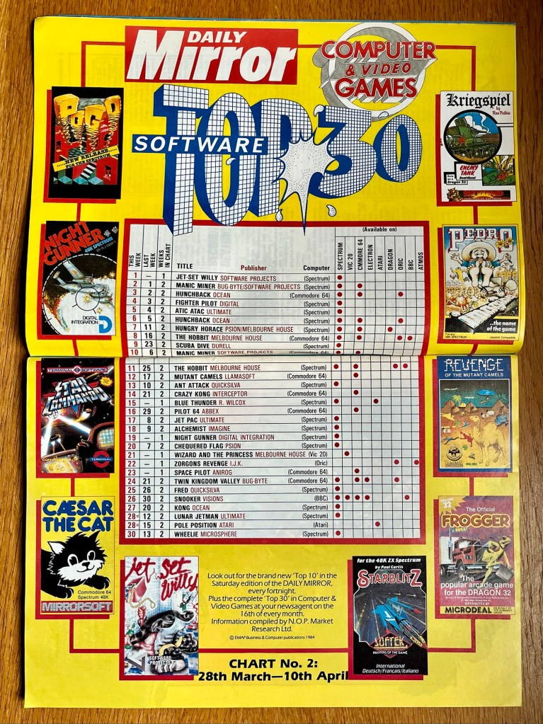 Next up are the movers and shakers in April 1984’s Software Top 30, sponsored by the Daily Mirror newspaper! Before we get to the games though, this recently introduced format, covering all systems at once, does give an interesting snapshot of the changing landscape of both what’s hot and what’s available where. The ZX Spectrum still dominates but the Commodore 64 has gone from only recently getting any chart coverage whatsoever to being represented by around half the top thirty, although you’re into the bottom half by the time we see Mutant Camels and a couple of other exclusives. Diminishing returns for the VIC-20, Electron, Atari, Dragon, Oric, BBC and Atmos though, which brings back painful memories of seeing this increasingly reflected on the game shop shelves I used to visit every Saturday afternoon! Jet Set Willy straight in at number one though, followed by Manic Miner and Hunchback. Not sure why The Hobbit wasn’t combined but looks like that would still have been flying high for the umpteenth month on the bounce had it been too. We’re seeing all the big 8-bit players starting to take hold though – Ultimate, Ocean, Imagine, Melbourne House and so on – and I also noted a new entry for Blue Thunder by R. Wilcox, who would shortly go on to rebadge himself as another household name of the era, Elite Systems!