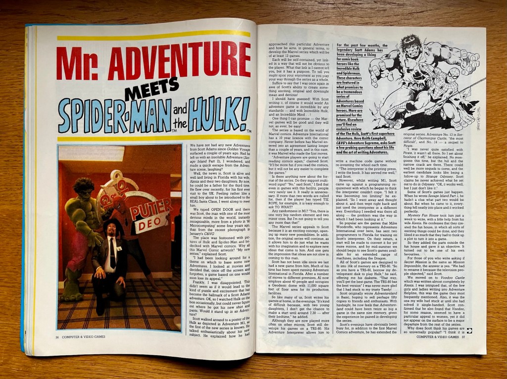 We’ve done a few of these things now, and as always, the plan is to flick through the magazine together, check out the news, reviews, features, type-ins and notable adverts (where that time capsule thing really comes into its own!), pulling out whatever catches my eye, in the order it catches it, and providing you with a bit of a commentary, and I think I’m going to start with the cover feature, as it actually relates to something other than a type-in for a change! As you can see by the wonderfully bold image at the top, we’re talking Marvel stuff, which honestly doesn’t excite me in the slightest, but as the text adventure pioneer behind the very first game I ever finished, the name Scott Adams does! And while Pirate Adventure on the VIC-20 does get a mention, this big interview is all about his new connection with Marvel, and the upcoming Questprobe Featuring The Hulk and Questprobe Featuring Spider-Man adventures, which were part of a trilogy concluded by a Human Torch and The Thing game, and if I remember right that will get its own cover feature in a year or so! In the meantime, The Hulk one is also reviewed in this issue so we’ll come back to that later.