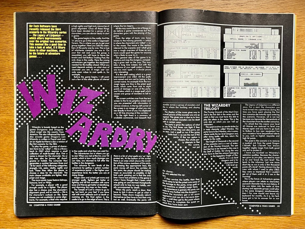 Time for some more reviews now because there’s a whole special section for adventure games, starting with Hulk or Hulk Adventure, depending on where you look in the review, or Questprobe Featuring The Hulk to use the name on the nearby advert, which I’m also going with! After moaning about inconsistency of rating systems earlier, there’s no ratings at all here, but I think they liked it, appreciating the no-wasted-location approach and the relative brevity of descriptive text… Unlike the rest of the reviews here, where it’s really hard to get a fix on the highlights with so many games with so many words and no score system! Let’s face it, you don’t want to read about reading about text adventures anyway, although El Diablero genuinely sounds like a fine bit of magical fantasy on the Dragon 32, and I remember God-bothering “educational adventure” Jericho Road, which sounds like £5.75 I’m glad I didn’t spend on the Spectrum! I do want to give a shoutout to Wizardry: The Legacy of Llylgamyn though, which gets a full double-page of its own, and while it’s very high end for the time – only running on Apple or IBM behemoths – it’s rightly being heralded as the future of adventure games, albeit assuming it will trickle down to more popular machines in future… Which it might have done to an extent but obviously these guys had no idea about 16-bit machines at this point, and quite how ubiquitous this stat-filled graphical screen format with 3D navigation that we’re seeing here for the first time would become in these D&D-style nerd-outs from then onwards!