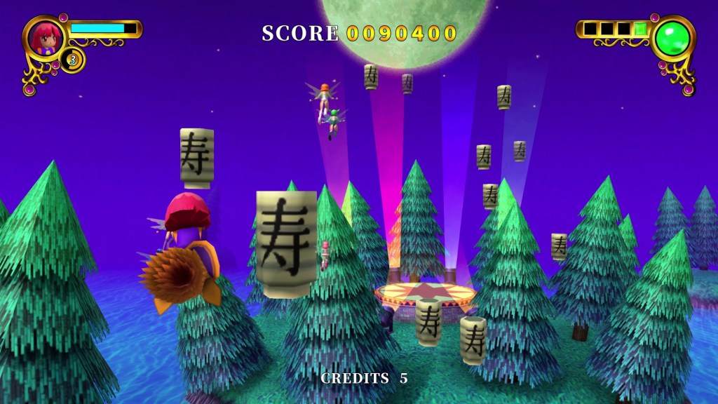 That reminds me, while you’re in the title screen menu looking for the option to invert the controls because some maniac thought it was a good idea to un-invert them by default, you’ll also find a couple of other game modes available. The first is Retro Mode, and – philistine that I am with such things – I’m honestly not sure if this is the original game jazzed up with some of the new gameplay conveniences I’ll cover in a sec, or the new game scaled back the other way somehow… You get the picture! And if not, you can compare the picture just above with the original Dreamcast version a few paragraphs back and decide for yourself! Either way though, it’s presented inside an old TV overlay thing with scanlines, and I can’t see any way to change that if such things offend you. It’s all harmless enough though, and it’s nice they went to the effort. The other mode on offer of Co-Op Mode, where you and a friend can play through the game together as Cotton and Silk, and from what I can tell with only a second controller but no actual friend, it seems like a really neat add-on. While we’re messing around in the title screen, let me quickly cover a couple of other options of note. Default difficulty is normal, and from the second of the five stages onwards, that feels about right, with a decent learning curve – particularly for the bosses – and enough of a compulsion to use another of your five credits when you eventually die because you always know you could do better next time, but that can depend on where you are in a level, and there’s more on that to come! There’s also easy and two levels of hard, though I’m not sure I’ll ever need either of the latter… And that’s where the other option I want to mention comes in! There’s one called “Fairies Talk” and you just want to turn it to off. Trust me!