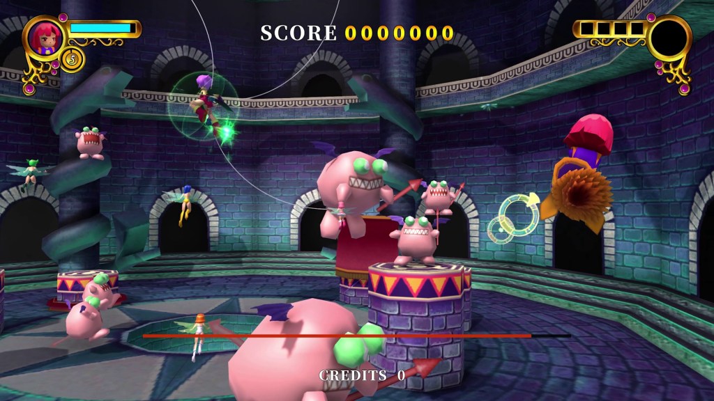 I’ll come back to that when I cover sound in a bit but it’s time we jumped into a regular game to find out if you’ll still be around to care! And the short answer is, I’m not really sure. You see, I have the advantage of bias towards the series and having played the Dreamcast version way more than it deserves as a result, so the total lack of instructions of any kind isn’t as much a problem to me as it might be. Let me try and take you through some of the first stage to explain what I mean. Once the camera has done its fancy thing and found its way behind you, you’re suddenly hurtling through this moonlit, medieval-style village, also illuminated by Christmas trees, and there’s bridges and rivers and little choke points to auto-negotiate, as well as loads of wild and wacky and always colourful enemies to shoot, but apart from enemies, you’ll soon work out you can also shoot the crates and barrels littering the streets, which produce two types of stars to collect. There’s no indication anywhere about what either does though, and nothing obvious seems to happen in-game or on the couple of meters at the top either, one of which is clearly health, and when you come across a health icon you’ll also know what that is. The multi-coloured one on the other side though? Well, when you were also just trying to work out what all the buttons do, you’ll have fired off your only magic “bomb” by mistake and seen it leaving that meter empty! Which brings us to the big jars with faces you sometimes see coming at you from the distance then probably disappearing behind you! It’s not easy at the start but shoot them enough times before that happens and they might drop a jewel, and if you shoot the jewel it will change colour. Manage to collect it and it will be stacked onto that magic meter, although at this stage you’ll still have no idea what any of it does let alone how it works! Then sometimes these jar-faces have a cage with a fairy in it attached to them that take even more shooting but will eventually add a new fairy to your little posse, which you can also use to do something. Maybe?
