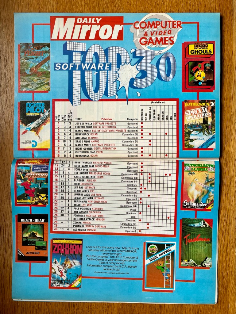 It’s the software charts next, which continues last month’s new top thirty format, spread across a whole double-page near the front of the magazine, paid for by The Daily Mirror newspaper and covering the Spectrum, VIC-20, Commodore 64, Electron, Atari, Dragon, Oric, BBC and “other” which seems totally pointless as there’s nothing in it, although the same is also true of the poor old Electron and Atari columns this month, although I think that last one is probably down to a mistake because Pole Position is still at number twenty-four. No consoles here though, Atari or otherwise, which stay separate in their own section, which we’ll get to later. What’s striking is the increasing dominance of the Spectrum and the C64, with just Fortress and The Hobbit representing the BBC, then the latter again and Hunchback on the Oric, and only Jetpac left waving the flag for us poor old VIC owners… Our days were collectively well and truly numbered at this point, and didn’t we know it! Jet Set Willy is still riding high at the top of the charts, just reiterating what a coup that cover feature type-in was, and Manic Miner wasn’t far behind either, just separated by Digital Integration’s primitive but impressive air combat-sim Fighter Pilot. These charts are multi-format but you’ve also got separate entries for each version, so you’ll see C64 repeats for some of the above later, while the aforementioned Hunchback is its first entry at number four. You can certainly see it clawing away at the Spectrum’s market share as the months go by though, and we’re seeing exclusives like Space Pilot, Blagger, Jumpin’ Jack and the iconic Aztec Challenge all making an impact. Just to close on the Spectrum, it might still be number one overall but there’s a load of old games like Ant Attack and Lunar Jet Man still skulking around, so will be interesting to see that pretty rapidly changing, I imagine, over the next few months.