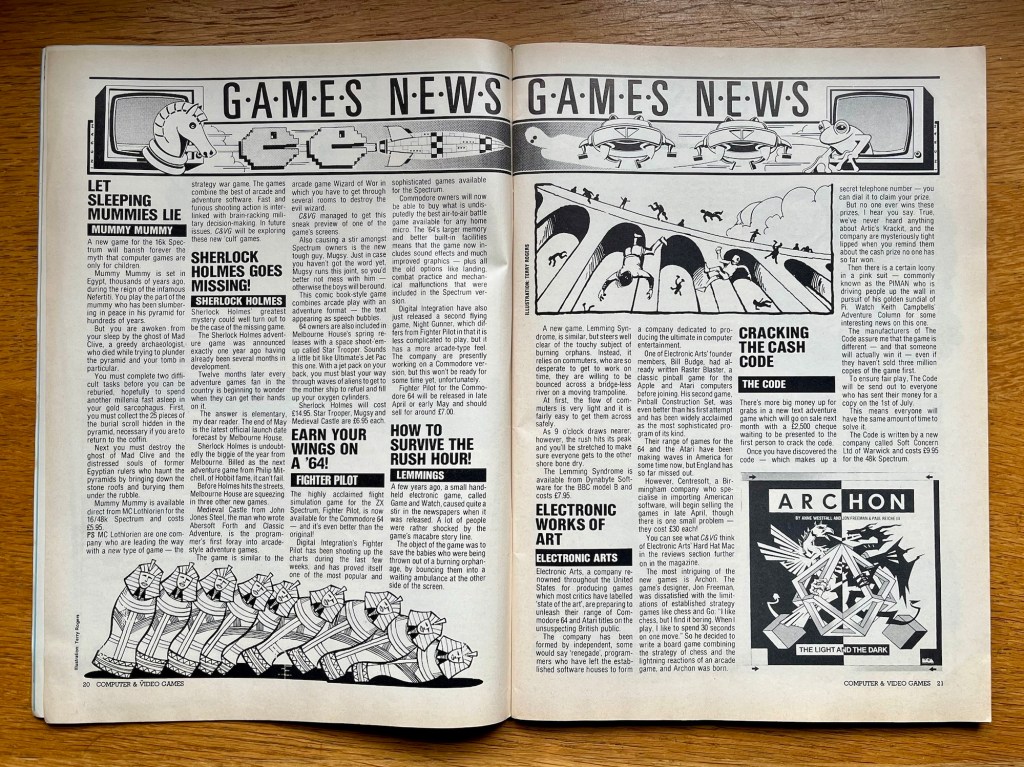I do believe it’s time for the Games News now. The news section is often taken up by new game announcements, and while it’s still the case this time, we begin with one for Mummy Mummy on the 16K Spectrum that it excitingly proclaims “will banish forever the myth that computer games are only for children…” It never really says how, apart from having a bloke called Mad Clive and a load of Ancient Egyptian souls to vanquish, but the interesting thing is that it’s made by a company called MC Lothlorien (nerds!) who are leading the way with a new type of game – the strategy war game! Now, Mummy Mummy might well be that too, but this revelation is written as a footnote to the main article so I’m not sure, describing a whole new genre that will combine the best of arcade and adventure software, with “fast and furious shooting action inter-linked with military decision making!” Having already heralded the demise of the shoot ‘em up as it was apparently being swept away by the strategy game in previous issues, definitely watch this space for more on “these new ‘cult’ games” in future Retro Rewinds! Elsewhere, the bloke who did The Hobbit has a new Sherlock Holmes text adventure up his sleeve, Fighter Pilot has arrived on the C64 and it’s better than the Spectrum original, and The Lemming Syndrome is bringing a now not unfamiliar concept to the BBC way ahead of its time! Electronic Arts has also announced it’s bringing its Atari and Commodore 64 range to the UK, which at this stage definitely included Pinball Construction Set and M.U.L.E. but I’m not sure what else; they’re going to cost £30 each though so you’d better start saving! Jeff Minter is back with the more reasonably priced Sheep in Space though, and no other news can follow that so let’s head over to the Software Reviews!