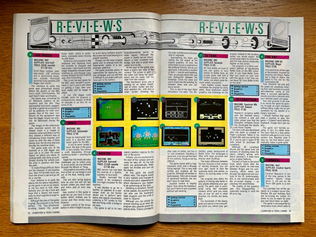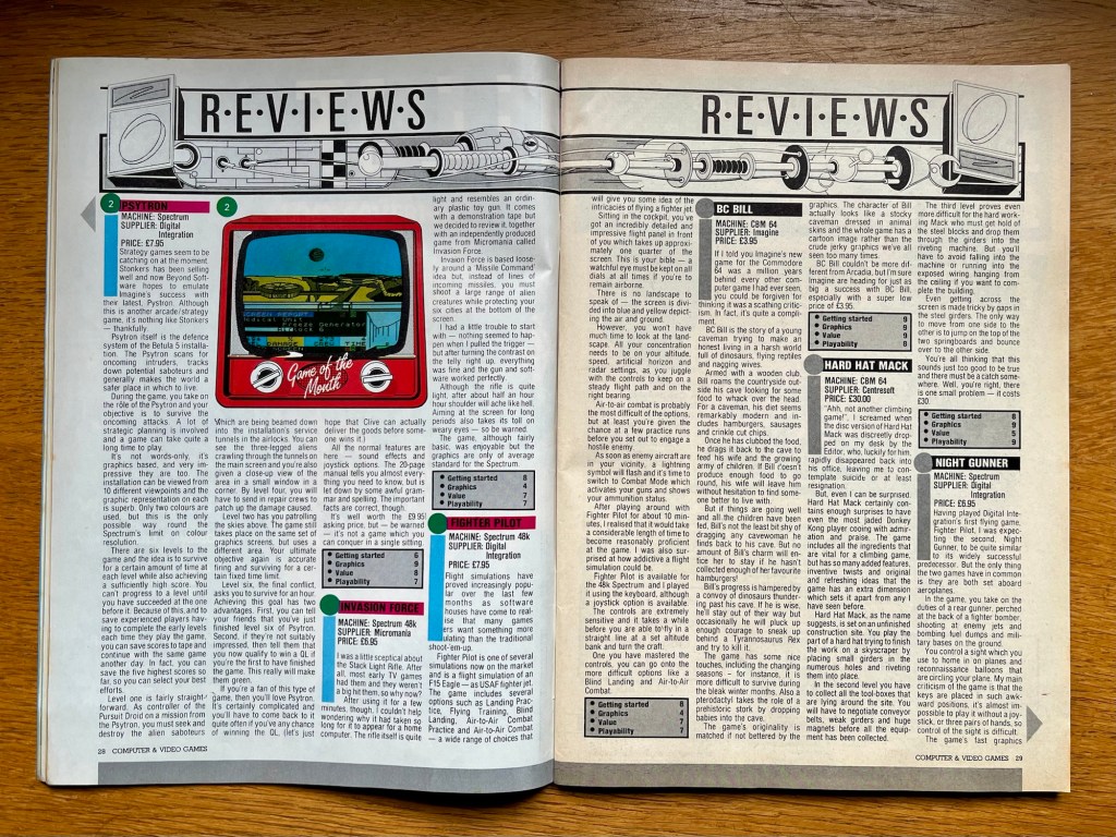 Right, let’s have a quick run-through of some of the other stuff moving and shaking in this months reviews but not all of it because we’re currently on page 25, they go on until page 38 (admittedly with a few adverts along the way, including a lovely double-page Pitfall II one), and there’s three or four per page! Ad Astra was the first that jumped out at me as one I know, scoring eights across the board for it’s Gyruss-like shooting on the Spectrum. Fighter Pilot on the Spectrum isn’t really justifying its chart position, scoring crap for looks and average for the rest, although I reckon that’s harsh! Its follow-up, Night Gunner, is probably the more interesting flight-sim option on there this month though, giving you a varied bunch of missions from the viewpoint of a rear-gunner for a change. Cartoon caveman BC Bill is scoring big on the C64 and deservedly so, and is probably where that other game of the month accolade should actually have gone if its scores here are anything to go by, with eight for playability as low as it goes. Slurpy on there is an above average Pac-Man meets Q*bert thing but is interesting as being an early release for Creative Sparks, Thorn EMI’s games offshoot who’d go on to release some great stuff like Submarine Commander! On the BBC, Trafalgar is a remake of the famous sea battle of the same name that is definitely one of those new strategy war games, so maybe C&VG is onto something after all, although this pioneer is let down by not coming with any instructions so all that military decision making is a bit uninformed! While they’re a bit crap, there’s at least another four BBC games reviewed in here, so maybe save your sympathy for us poor old VIC-20 owners instead, although we were getting the remarkable take on Atic-Atic that is Tower of Evil this month! By the way, the deep-dive I did on that had a lengthy preamble on this very issue of C&VG that actually inspired this very series of features, so if you’re reading this you can probably skip at least half of that if you’ve only got time for a quick look!