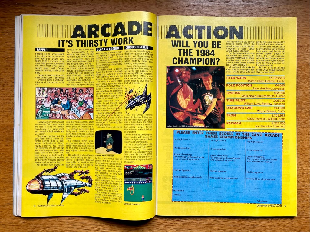 There’s more but little of real note so let’s jump over to Arcade Action next for all that stuff you could only ever dream of playing at home! And it sounds like they listened to my complaint about stupid cartoons instead of screenshots last time out because there’s an actual picture of multi-event Circus Charlie in action, though I’d have preferred one of this month’s headline act, Tapper, instead. I love seeing stuff like this appearing for the very first time, and reading about things that would go on to become all-time favourites of mine, way before I knew it! Still such a unique concept too, with you running up and down increasingly hectic bars, serving customers, collecting empties and grabbing tips – so simple, so addictive, and as much fun to play now as it was back then. Classic Konami but less so classic Atari for this month’s final game, Cloak & Dagger, which is an alright Robotron-style shooter I suppose. That’s one page out of the two that make up this section, then the other is an entry form for the 1984 Computer & Video Games Arcade Games Champion competition! Not the catchiest but maybe that’s something the current champion and future magazine editor Julian Rignall might be able to sort out, once he’s done hanging out with Dave Lee Travis at least!