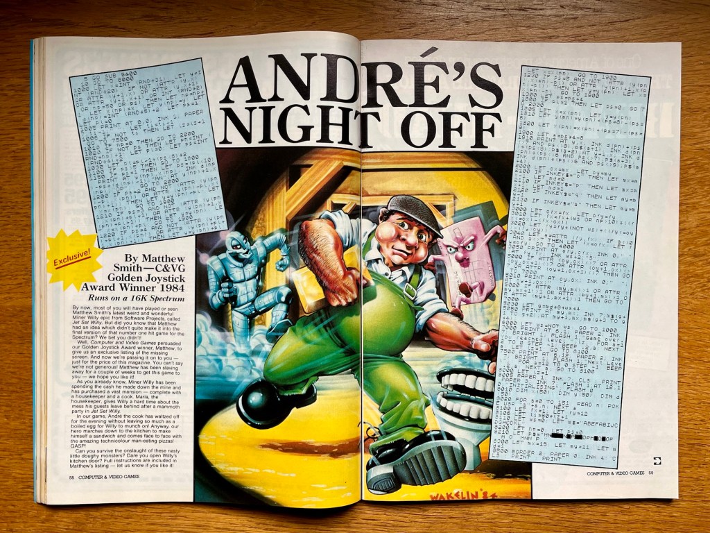 Right, with that I think we can turn our attention to the June 1984 issue! As always, the plan is to flick through the magazine together, check out the news, reviews, features, type-ins and notable adverts (where that time capsule thing really comes into its own!), pulling out whatever catches my eye, in the order it catches it, and providing you with a bit of commentary on top. And we’re going to begin with this month’s cover feature, which you might have already noticed has something to do with a certain Miner Willy! I actually thought the days of cover art based on a type-in might be over by now (not that I’ve got a problem with it but times were changing), although this is a very special type-in because it’s not only by none other than Matthew Smith, of Manic Miner and Jet Set Willy fame, but is also an exclusive listing for the 16K ZX Spectrum that adds a missing JSW screen! Or, realistically, based on one that never made the cut, but all the same, this is great! André the cook has disappeared for the evening leaving Willy with nothing to eat, so he ventures into the kitchen in his mansion (paid for by his previous mining exploits) only to come face-to-face with a load of man-eating pizzas! It’s a simple case of avoiding them for as long as the clock tells you to, and you really couldn’t ask for more from a BASIC game in a magazine!