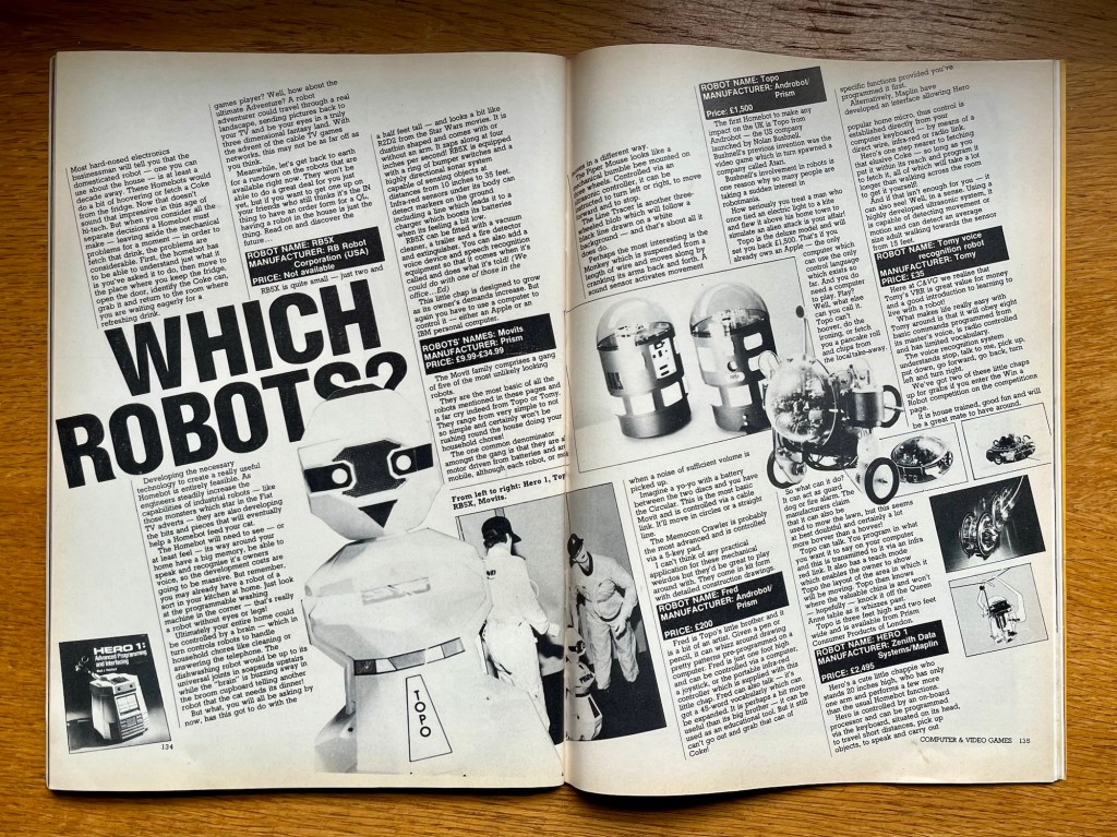 I know I recently did a deep-dive on Battle Chess for the Amiga but even I can’t face a whole double-page feature on chess computers, and the same for some weird puzzle adventure competition thing called Quo Vadis, where you can win a Coleco Adam computer, so I’ll skip to something far more exciting, the domestic robot! That said, I lost interest in these when I didn’t get a Big Trak the previous Christmas, although looking at the price of some of these, that was probably a lucky escape! Movits start a bit cheaper though, even if they are just little animals with motors in them, so maybe a Tomy VRR (voice recognition robot) is a better bet for basic domestic duties at £35. Topo is by Androbot, launched by Atari’s Nolan Bushnell, and for your £1,500 you’ll be getting some guard dog and fire alarm functionality, and you can program it to do various other things as long as you’ve got an Apple computer to do it on! Fred is Topo’s little brother, at a less eye-watering £200, and it can draw and say a few words and you can move it with a joystick on your computer but still can’t carry some fruit to your dad like Big Trak could! You’ll also be needing either an Apple or IBM PC to get the most out of the RB5X, looking a bit like R2D2 and almost as useful, with a vacuum cleaner, a trailer, a fire detector and an extinguisher too! No price for that one but costly as it sounds, I reckon it won’t be the £2,495 for the HERO 1 from Zenith Data Systems and Maplin, with a programmable processor and a robot arm to pick stuff up and bring it to you, assuming you’ve programmed it to do so and it’s close enough, so there may be an argument for saving your money, stop being so lazy and getting it yourself!