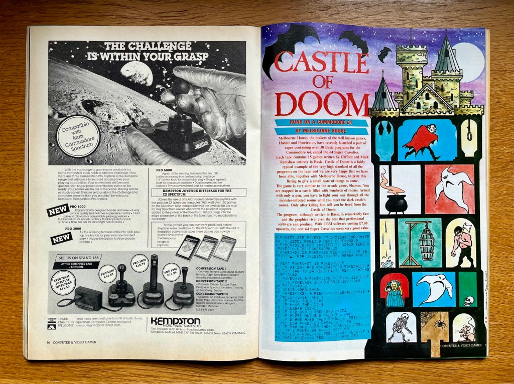 We’re entering the realm of the type-in games listings now, and following on from that Jet Set Willy expansion from earlier, first up is Galactic Space Academy, a surprisingly complex space shoot ‘em up for the VIC-20 (plus 3K expansion), with pages of POKE and DATA commands to sink your teeth into! Commodore 64 fans shouldn’t feel left out either because Castle of Doom is a spooky take on the arcade game Shamus by none other than Melbourne House, who in reality are peddling their two new BASIC compilations it features on. There’s also a top-down racer called Road Runner for the TI-99/4A, Spider Grid, which is a Genesis arcade game clone for the Dragon 32, and an even more blatant arcade clone called none other than Missile Command for the BBC! The ORIC has an omelette making (or egg chucking) game called, er, Omelette, and finally the Spectrum is also getting a not particularly subtle second game listing for Wonderman, which sounds like Space Invaders with Kryptonite!
