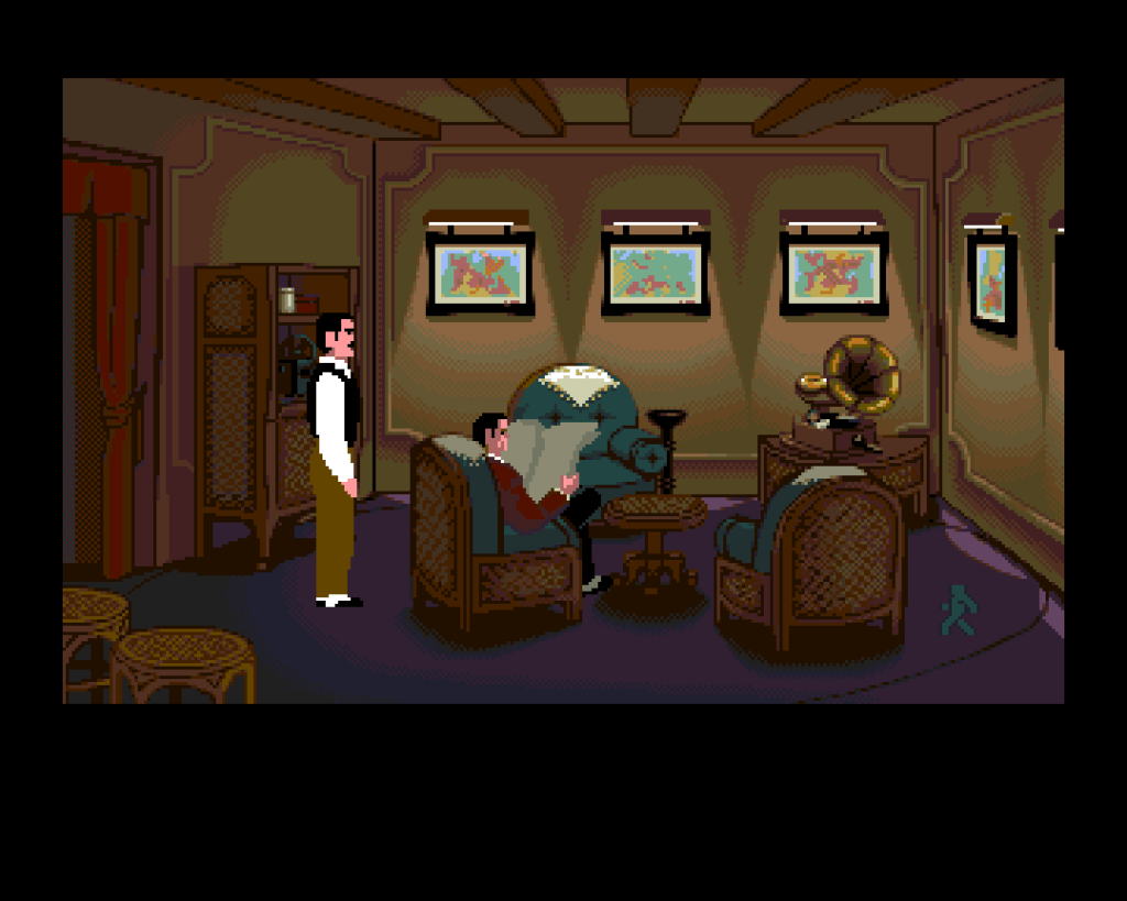 Last up with this week, Cruise for a Corpse, a point-and-click, Agatha Christie-inspired murder-mystery by Delphine Software in 1991, which I’ve been playing on the Amiga A500 Mini, as a policeman investigating a death on what I guess is an early twentieth century cruise ship. It all takes place over a single day, with you advancing the clock by ten minutes every time you progress each part of your investigation or reveal the next clue. There’s an elegant control method behind this, all on a simple right-click to browse possible courses of action then a left-click to select one, intuitively leading to further possibilities beneath. You’ll need to keep your eyes open though – the next clue might be well hidden, and life is going on while you play too, so it might have appeared somewhere you’ve already been since you were last there! And that includes the many interactions you’ll have with the characters (or suspects!) you’ll meet, who will become quite familiar throughout the day, and are a varied, well-written bunch with increasingly complex relationships with each other and the mystery at hand. It plays out in an attractive, cleverly animated, polygonal meets almost cel-shaded pixel-art period cartoon style, with conversations on a more realistic, personal scale, as was often the case with these games at the time. Sound is occasional but atmospheric, whether a jolly incidental chiptune or the caw of gulls on deck, which, incidentally, also has a lovely swaying motion when you’re out there! There’s usually some kind of movement to add interest to the various environments all over the ship though, such as the gramophone turning as it plays in the smoking room or the swinging doors in the bar, all reflecting the overall polish you’d expect from these guys at their creative peak! The interface might be unique but in typical point and click fashion, you need to go everywhere and try everything, and there are times where you’ll be tearing your hair out trying to work out what you’ve missed so you can experience the relief of the clock appearing and finally moving time on, but I found this added realism over any kind of frustration… Less so for the continuous waiting for the next bit to load though! But that’s the price you pay for something as complex, puzzling and cinematic as this, I guess, and is still totally worth it!