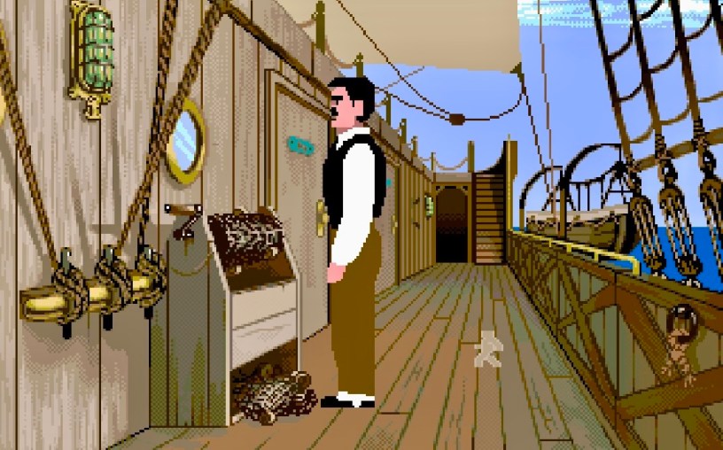 Last up with this week, Cruise for a Corpse, a point-and-click, Agatha Christie-inspired murder-mystery by Delphine Software in 1991, which I’ve been playing on the Amiga A500 Mini, as a policeman investigating a death on what I guess is an early twentieth century cruise ship. It all takes place over a single day, with you advancing the clock by ten minutes every time you progress each part of your investigation or reveal the next clue. There’s an elegant control method behind this, all on a simple right-click to browse possible courses of action then a left-click to select one, intuitively leading to further possibilities beneath. You’ll need to keep your eyes open though – the next clue might be well hidden, and life is going on while you play too, so it might have appeared somewhere you’ve already been since you were last there! And that includes the many interactions you’ll have with the characters (or suspects!) you’ll meet, who will become quite familiar throughout the day, and are a varied, well-written bunch with increasingly complex relationships with each other and the mystery at hand. It plays out in an attractive, cleverly animated, polygonal meets almost cel-shaded pixel-art period cartoon style, with conversations on a more realistic, personal scale, as was often the case with these games at the time. Sound is occasional but atmospheric, whether a jolly incidental chiptune or the caw of gulls on deck, which, incidentally, also has a lovely swaying motion when you’re out there! There’s usually some kind of movement to add interest to the various environments all over the ship though, such as the gramophone turning as it plays in the smoking room or the swinging doors in the bar, all reflecting the overall polish you’d expect from these guys at their creative peak! The interface might be unique but in typical point and click fashion, you need to go everywhere and try everything, and there are times where you’ll be tearing your hair out trying to work out what you’ve missed so you can experience the relief of the clock appearing and finally moving time on, but I found this added realism over any kind of frustration… Less so for the continuous waiting for the next bit to load though! But that’s the price you pay for something as complex, puzzling and cinematic as this, I guess, and is still totally worth it!