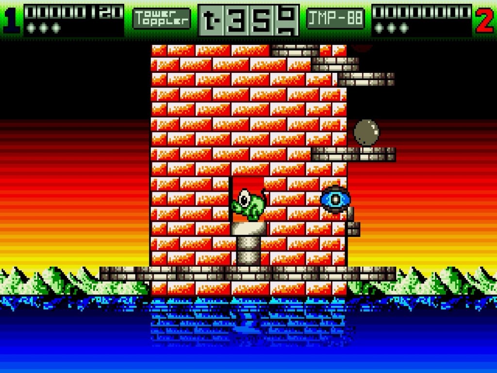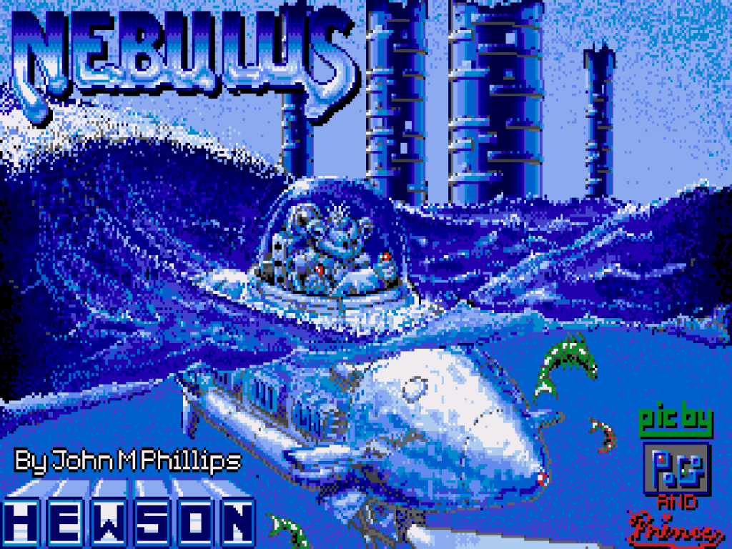 As unqualified as I might be to say so, I’ve always thought Nebulus was one of the most technically impressive games I ever owned on the ZX Spectrum. Likewise the Commodore 64 version when I got to that, which is probably now the one I’ve played the most. And that was still the case when I, er, picked up a copy on Atari ST! One of the best-looking games on any system it’s ever appeared on too. Not to mention one of the hardest! It’s a wonderfully infuriating and hopelessly addictive platformer by Hewson in 1987, where your little green frog thing has to make his way up a series of treacherous towers in the middle of the sea, planting a bomb at the top of each to collapse it into the water before getting into his submarine for a quick horizontal shoot ‘em up to the next one. You’ll need to negotiate stairs, elevators and all sorts of hazards on the way up, as the tower rotates clockwise and anti-clockwise while you move left or right, or even through the middle of it to the other side. The sense of depth this creates is incredible, and until the SNES came along with its wild Mode 7 effects, Nebulus was a real showcase wherever you played. This version was probably where it’s incredible pixel art came to life the most though, with gorgeous textures and lighting, as well as reflections in the water… Which you’ll be seeing a lot of, every time you’re knocked back down to the start again!