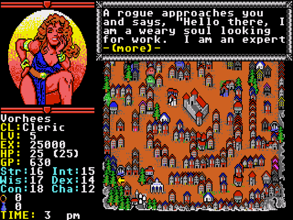 As you can imagine, I’ve had loads of fun messing around with these games while I’ve been scribbling notes and grabbing screenshots, but in the case of Hillsfar, I was already in the middle of a game when I started… Not that it wouldn’t have been here anyway but I’ll come back to that! In the meantime, it’s proper official nerd stuff from Strategic Simulations in 1989, and follows on from its possibly better-known AD&D predecessor, Pool of Radiance. Wasn’t so much a sequel as a side-quest though, tiding you over until Curse of the Azure Bonds came along. Either way, it’s a role-playing game set in the high fantasy of Forgotten Realms, where you create a character from various races and classes, which in turn open up a series of unique quests played out in over-world and location-based map views, side-scrolling travelling views (where you get to ride a horse against the backdrop of a lovely pixel-art forest), then there’s a top-down dungeon view for your storyline or treasure-hunting business inside specific locations. It’s pretty much open-world but progress is guided by a series of quest-related missions, occasionally interrupted by random encounters or locations of interest, and you’ve got all the usual stats and dice-roll interactions, plus a bit of simple projectile and hand-to-hand combat, and while maybe not as deep as the other three games that eventually completed the rest of the series, it’s just right for an AD&D dabbler like me to aimlessly grind away in to my heart’s content!