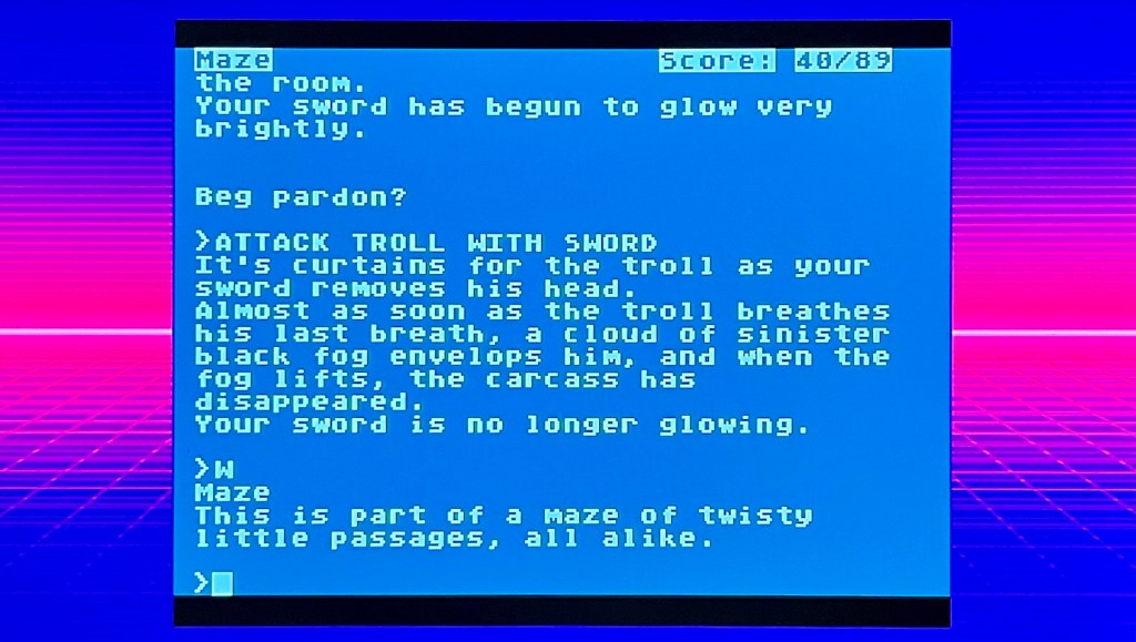 I’m going to start with something ancient this time, Zork I: The Great Underground Empire! Its original 1977 mainframe computer incarnation wasn’t just a pioneer of interactive fiction and the grandaddy of the text adventure, but also a first taste of how a computer could bring an immersive world to life, allowing the player to explore and experience it, solving problems and overcoming challenges. Zork, as it was known, was then split into three connected but standalone episodes for its commercial release in 1980, and I’ve been playing the 1983 Atari 8-bit version of the first of those on The 400 Mini (with real keyboard attached!), which was my first time playing in a long time and was even more impressive for it! By the way, that’s also the reason for the crappy phone pic of a TV screen here! Anyway, you begin outside a very regular white house, which, once you’re in, will be both gateway and hub to your exploration of the ruins of The Great Underground Empire, a massive set of caves that expand ever further downwards over the course of the three episodes, built by an advanced but forgotten civilisation led by someone with a thing for large-scale vanity projects, like building huge dams or museums down there! These, as well as more natural locations, then play host to the treasures you need to find and get back above ground in one piece, as well as the dangers you’ll need to avoid and the puzzles you’ll need to solve to recover them, which can be some proper, drawn-out conundrums, but it’s all so well described that you’ll get there in the end if you’re paying attention, and with a bit of lateral thinking! What impresses me most about this game though, is how it’s relatively small number of locations (albeit bolstered by many pass-through areas) are so smartly interconnected, giving them a very impressive “false” sense of scale, while also remaining easily navigable once you’ve been around them a few times, and without being a chore once you have through some neatly evolving joints. The limited vocabulary and primitive parser means it takes a while to adapt to what it’s asking of you but you do latch on and it all becomes comfortably familiar soon enough. And with no reliance on any presentation beyond displaying text whatsoever, it’s absolutely timeless and still so enjoyable today, although beating it took some doing, so I might have a break now before I jump into episode two!
