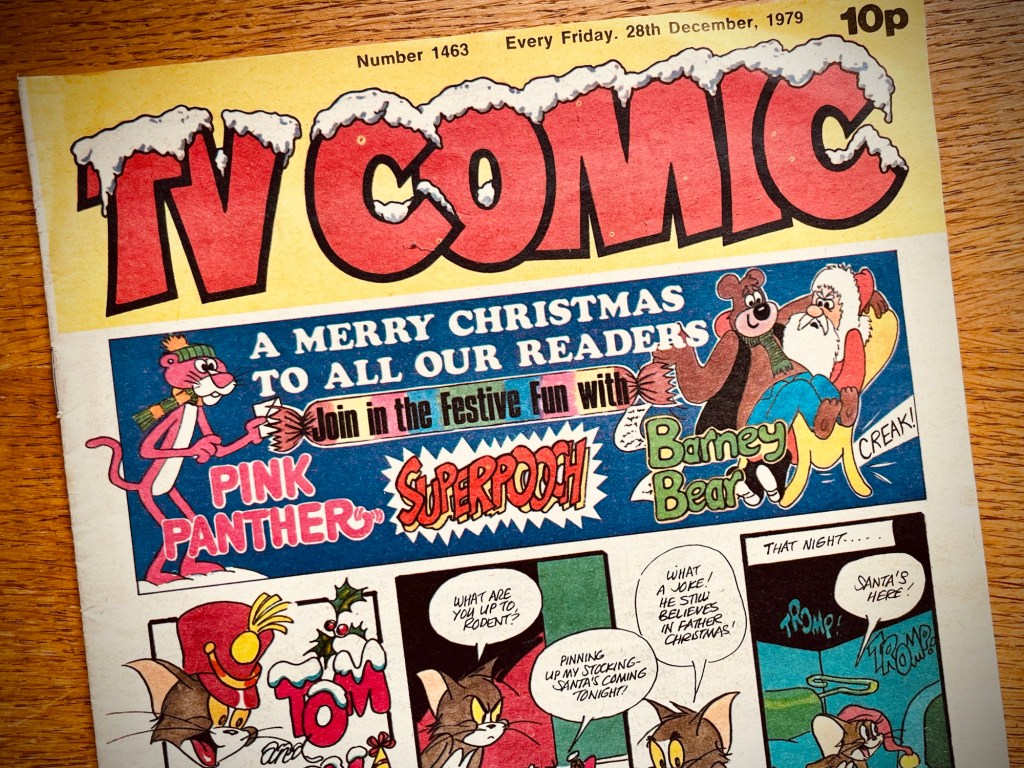 It’s Christmas Eve 1979, and I’m in Bedford town centre with my Mum. Not sure what she’d forgotten to buy at this late stage but I’ve got the Christmas issue of TV Comic in my hand, and there’s either rain or sleet or snow in the streetlights around the big old church in St. Paul’s Square, meaning everywhere must be about to close and I’m guessing we’re on our way home, being at that end of town. It’s weird how these split-second memories of nothing in particular can stick with you for forty-five years! Anyway, TV Comic was my thing aged seven, and would be for a couple more years before Beano or Whoopee or Whizzer & Chips or the occasional copy of Look-in or TV Tops took over for a while. It had been around since 1954, when early television favourites like Muffin the Mule got the comic strip treatment, and that format would continue until 1984, constantly evolving with current tastes and taking in the likes of Tom and Jerry, Bugs Bunny, Doctor Who, Basil Brush, Laurel and Hardy, Rod Hull and Emu, Charlie’s Angels and Sooty along the way… If it was on the telly and popular it was in – even stuff from adverts like The Milky Bar Kid and Buzby!