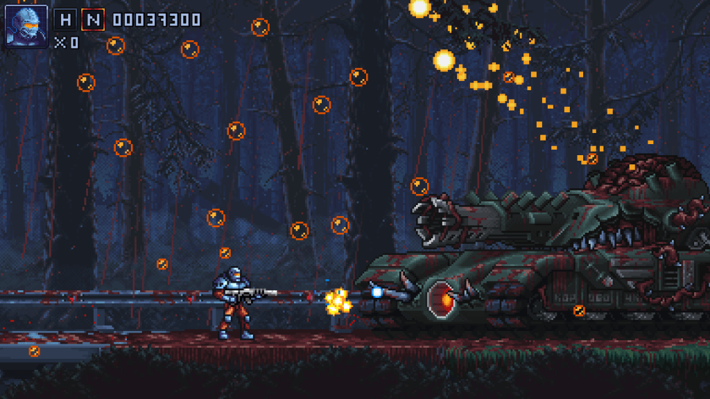 It might not be the genuine article but Iron Meat, launched a couple of weeks ago, is the best Contra game I’ve played in years, way better than any of the real thing, including this year’s Contra: Operation Galuda. Unlike that one though, where the demo had exactly the opposite effect to its intended purpose, I actually deleted the demo for this one way before the end of the very first level because I was already sold! It’s a high octane indie run and gun shooter that plays as heavy metal as its soundtrack, as you blast through a retro-inspired future overrun by an iron-guzzling mass of mutated meat resulting from some secret experiment on the Moon gone wrong! Perfect excuse for some stunning pixel-art gore but that’s only half the visual story because there’s so much variety, life and character in what could easily have been generic, military-themed environments, with absolutely gorgeous spot-lighting effects, explosions, smoke and the like, mixed with larger-scale environmental set-pieces and so many layers of parallax scrolling! Some great big bosses too, who play remarkably fair for this kind of game, and with fifteen lives the rest does too despite the mass of enemies coming from all sides, and it controls so well, with your little Robocop-type dude moving smoothly and shooting fluidly. Then there’s the cutscenes, the power-ups, the unlockables, the customisation… But most of all there’s so much fun! I’m played on PC via Steam but it’s out all over the place and I can’t recommend it enough!