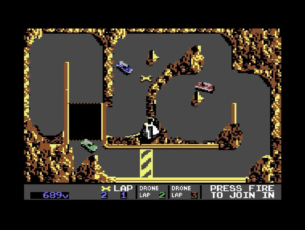 As much as I love a single-screen platformer, there’s other things I love more… Such as top-down racers, and while Atari’s Super Sprint might be the one I love above all the rest, as I’ve already noted, that’s sadly not the case on the Commodore 64. Its post-apocalyptic 1989 successor though… Badlands is Super Sprint with guns in a Mad Max setting, and was ported by Teque Software to the C64 then published by Domark a year later, where all that additional weight from the weapons and armour has translated into a far more precise and predictable (and therefore playable) game, and an excellent conversion to boot! Okay, it’s a little slower than both the original and the Atari ST version I bought at the time, but it’s fast enough and its not like you’re comparing them side-by-side while you’re fighting your way around three laps of each of eight nuclear wastelands anyway. And you’ll ideally be doing that against a friend and one computer opponent, or against two solo, which also offers a decent challenge from just a couple of tracks in. You can power-up your car for speed, destruction or protection between races to boost your chances as things hot up, which does make a noticeable difference (especially to the weedy default guns), but just knowing the tracks and keeping the car within your comfort zone is equally advantageous. The relatively simple presentation of the original for the time means it’s all pretty much here, and like that version, while some of the tracks are a bit sparse, a couple of them are really atmospheric too, with a great mish-mash of sunburnt, organic colours creating a real sense of place, along with a decent variety of layouts. Which all feel great to race on and will never get old to me!