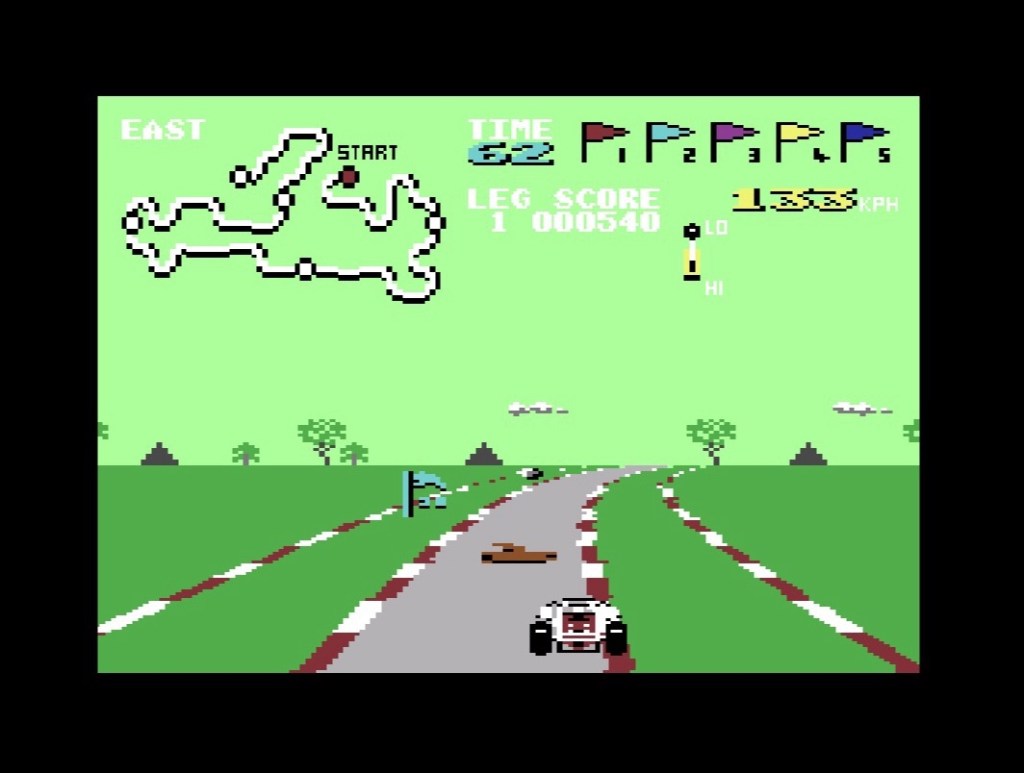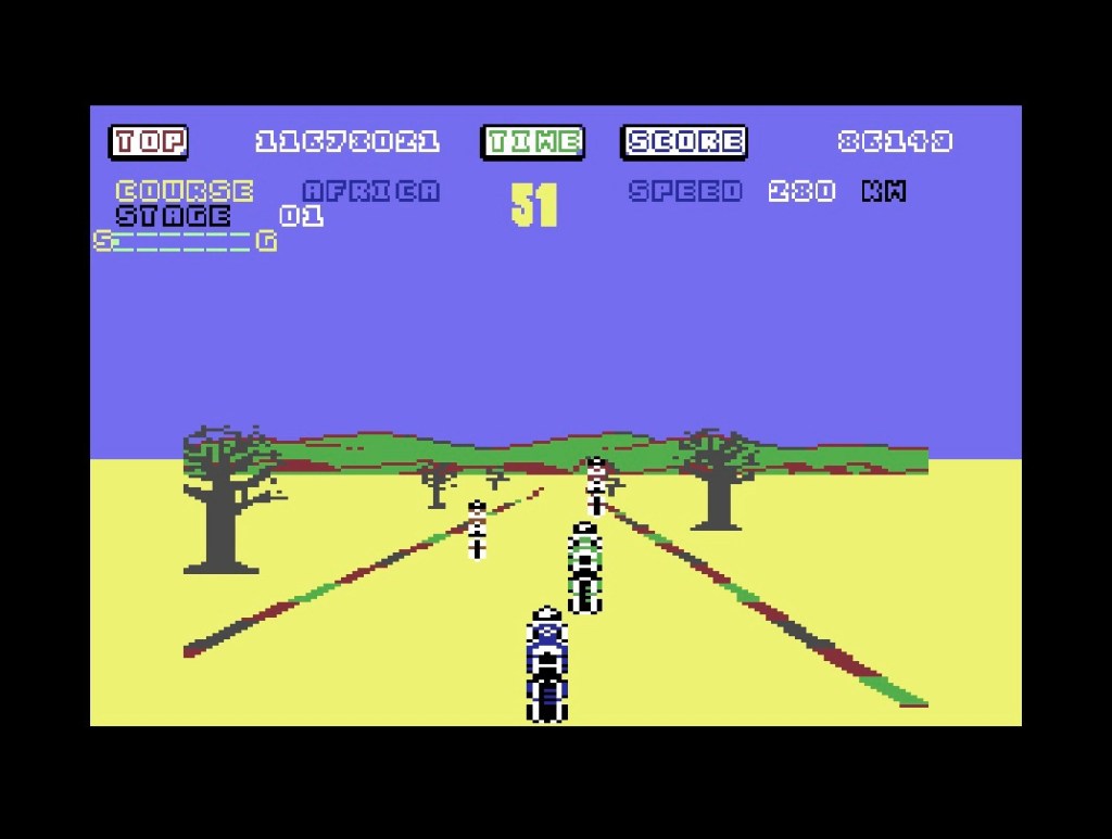 I think I was playing the Commodore 64 port of Road Blasters when I first started toying with what you’re now reading… The one from 1988 that looks like it’s an Atari 2600 game from five years earlier, moves at a snail’s pace, and where you don’t need to steer because the road moves around the car for you! Anyway, it got me thinking that surely the C64 isn’t as bad at arcade conversions as its reputation suggests? You know, everything looking overly blocky in stuff like Wonder Boy or Tapper or Out Run, with big black lines removing any trace of character or detail. Which reminds me, we also know it can’t do racing games period – okay, I know everyone is down on the ZX Spectrum version of Out Run nowadays, even if they weren’t at the time, but have you seen the abominations that are Enduro Racer and Super Hang-on (pictured below)? A real sight to behold! Then there was Hard Drivin’ and WEC Le Mans, Chase H.Q. and Cisco Heat, and we can further extend this line of thought to 3D games in general, and the likes of G-LOC, Space Harrier and After Burner, where I guess you could say well done for trying but could equally say why bother!