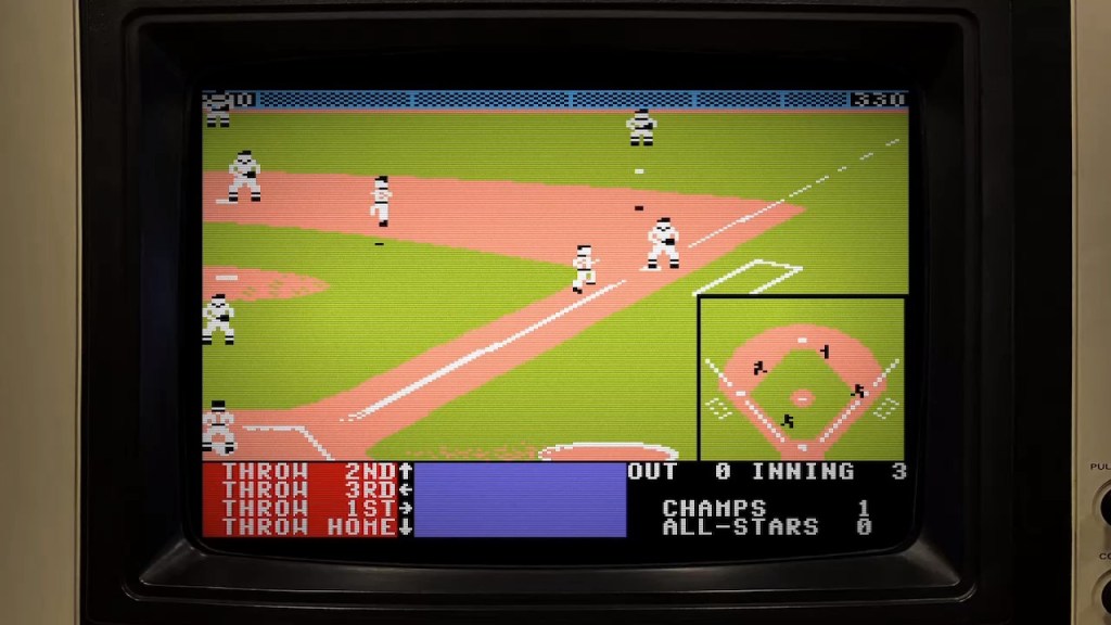 Although it took me almost forty years to actually get my hands on it, the original Commodore 64 version of Hardball from 1986 was the first baseball game that ever jumped out at me – one of those where a screenshot in something like Computer & Video Games magazine alone could sell you on a game, whether you were interested in the subject matter or not! Happened all over again a year later too, albeit in the cinema this time, when it appeared in The Princess Bride, but it would eventually take the arrival of The 400 Mini – exactly coinciding with my new-found love of baseball back in 2023 – for me to discover this 1987 Atari 8-bit release. Also plays great on the recent Atari 50: The First Console War DLC it came with on Nintendo Switch (pictured here) and elsewhere! It’s an early (but not the earliest) example of the TV-style presentation we’re familiar with today, with an over-the-shoulder view from the pitcher, neatly changing perspective depending on whether the batter is left- or right-handed, then switching the camera to a split fielding view as required. There’s intuitive but thorough pitching and batting control, while fielding and also coaching are enjoyably simple, and although there’s just two made-up teams to play with, and playing solo you’ll soon be winning games more often than not, it’s well-paced with a nice blend of arcade and simulation, and is a lot of fun all the same. And if the sound is ambitious but functional at best, the big, detailed, realistically animated graphics more than take the strain, and are way above and beyond expectations on any 8-bit system of the time. And if this was the only baseball game I’d owned since, I’d still be happy!