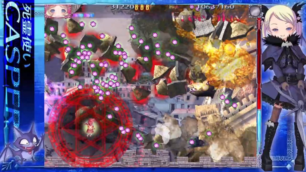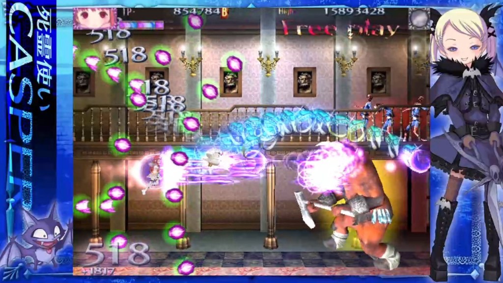 Apart from the multicoloured chaos you’re responsible for, the environment is suddenly incredibly sandstone and Middle Eastern-looking, which also goes for the Detritus stage, or Demon From The Depths, where you’re travelling upwards through those falling bits of tower (where the pig-chef monsters from the first game have now taken up residence!) as a bunch of giant anacondas (or similarly scary big snakes) slither around menacing, in preparation for the boss, Heavy Snake! Sounds like it should be in another game but like its minions, that looks a bit rubbish too – plenty of size but just not “heavy” enough (or, more specifically, “solid” enough)! I’ll quickly mention that the two levels we’ve just touched on, as well as the next, Haunted Ruins, or Shadows in the Ruins, can be played in any order before the final level, known as Chateau, or Bewitched Palace. Which is all pretty pointless because there’s none of the enforced difficulty selection of Deathsmiles here, where, as described earlier, you would pick the stage order and your preferred difficulty for whatever you picked, whereas in the original arcade game (rather than any later console-specific modes), you could only use each difficulty level once, and had to use all of them at some point. Anyway, Haunted Ruins is a once-grand and luxurious gothic mansion that’s a bit of a poor relative to something out of Castlevania, with a borderline rubbish-looking boss called Nice Older Man Tamecos Tamecos… Actually, I’m now wondering if they thought all of these were so good they named them twice, or if the words are just being repeated on screen for effect? No matter, he’s a very tall, aristocratic Slender Man meets Frankenstein’s Monster-type who chucks some alternately dense and downright vicious bullet spreads out of his shoes as he also tries to stomp on you mid-comical, Basil Fawlty-esque walk, occasionally interrupted by a close-up battle with his massive face! He’s alright though, and from there you’re on the home stretch, although the last bit (where we found all those crappy chess pieces earlier) is virtually as long as the rest of the game combined… Which still isn’t that long!